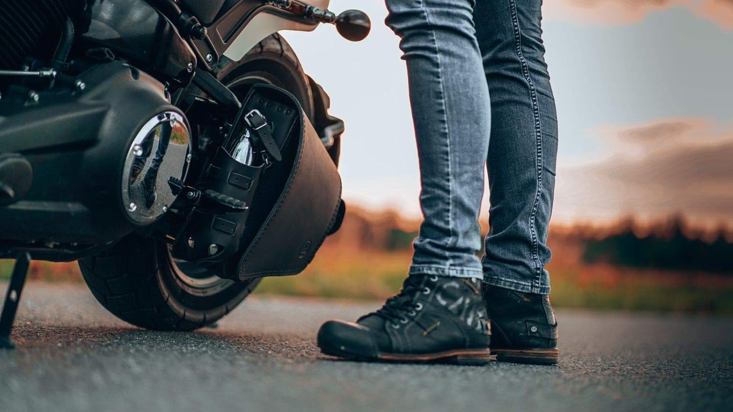 Outsider, motorcycle leather saddle bag for Harley Softail, tool bag with bottle pocket