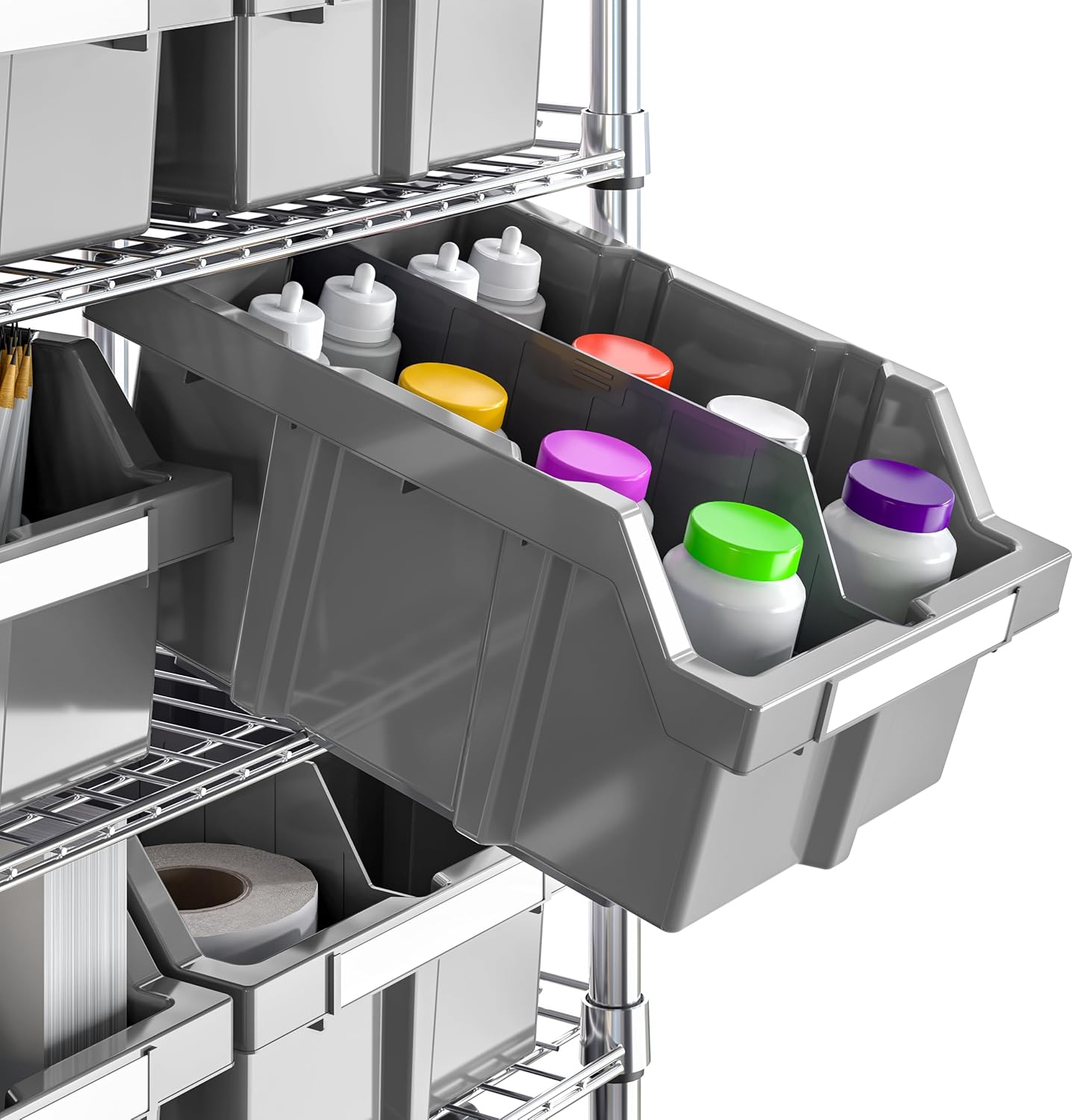 - 21 BINS — 21 removeable high-impact polypropylene (HIPP) gray bins: 6 X-Large (16” W x 14” D x 7” H) and 15 Large (10.5” W x 14” D x 7” H); Plus 4 bin dividers and 21 bin labels.