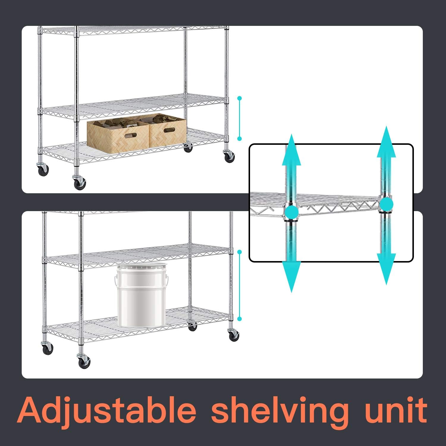 - MULTIFUNCTIONALITY - This Commercial metal shelving unit can be used virtually anywhere, in the kitchen, the bathroom, the garage, outdoor shed, and more. It’s perfect for storing tools, clothes, books, and whatever else is taking up space in your home or office. Equipped with wheels, you can transport this unit smoothly and efficiently room to room.