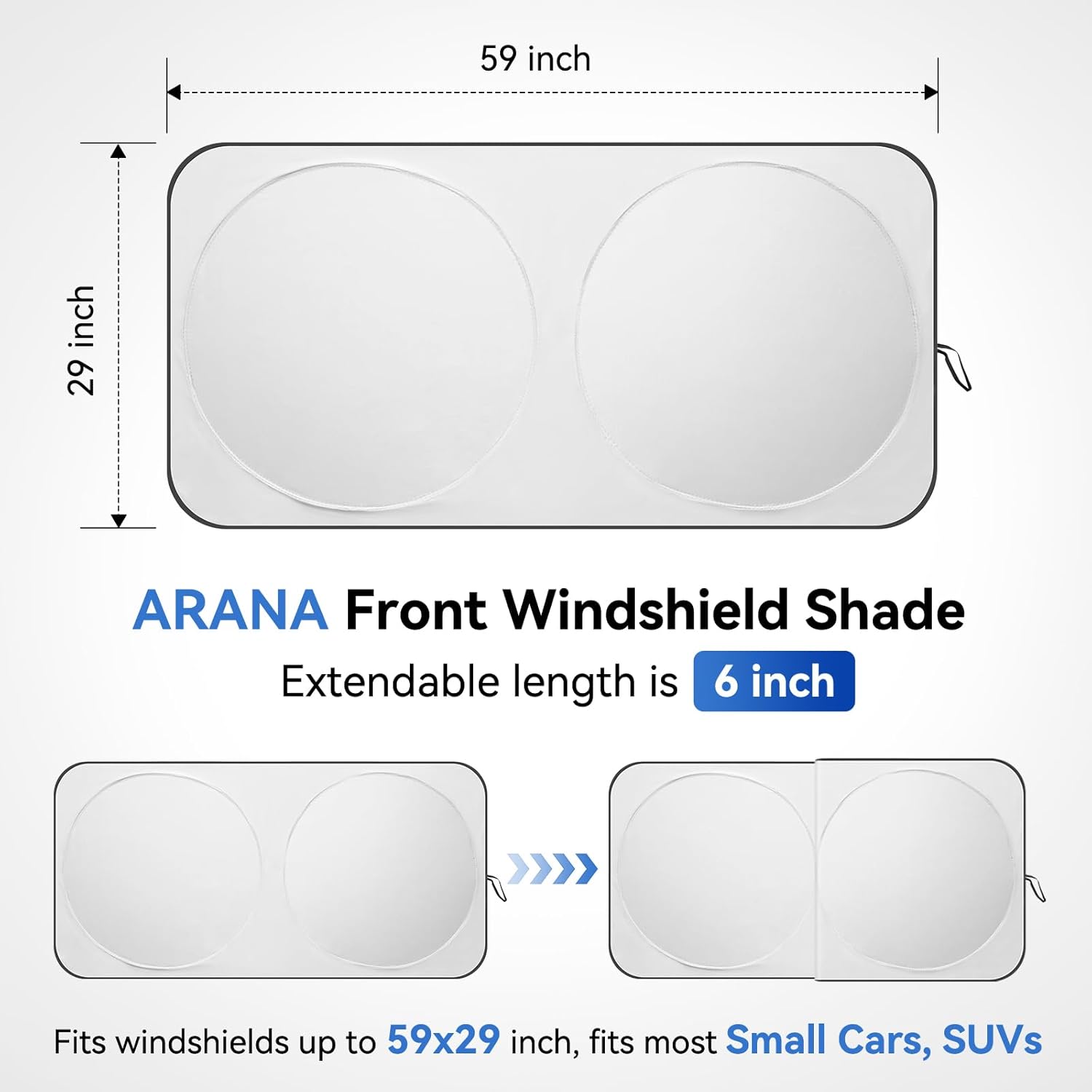 - Adjustable Windshield Sunshade: Designed for versatility, ARANA sun shade extends to 59x29 inches with an 8-inch adjustable center, fitting most small cars, mini SUVs for seamless windshield coverage