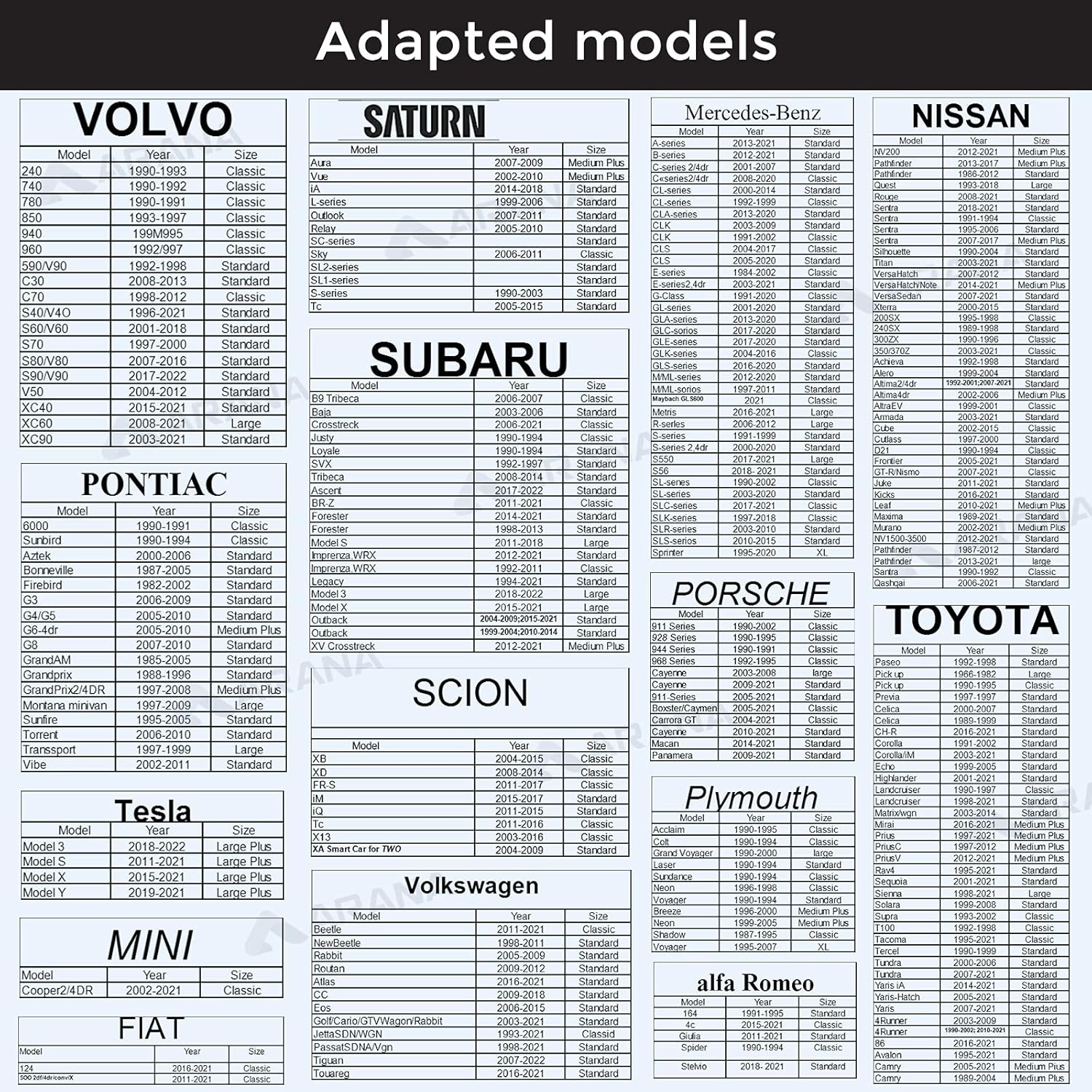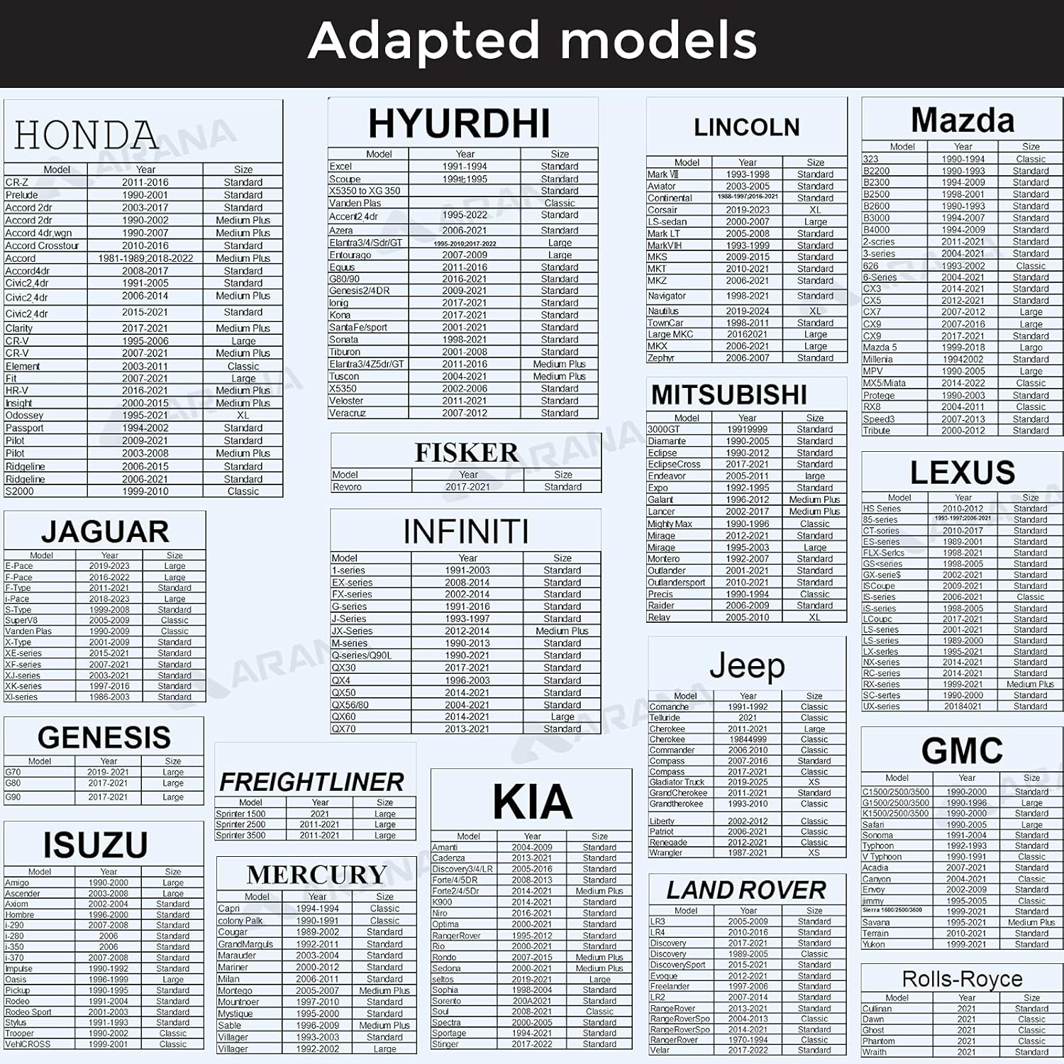 - ARANA Promise: With 180 days of product support, ARANA ensures a perfect fit for your vehicle. Use the size chart to choose the right one, and don't hesitate to reach out for any questions, let's make this summer hassle-free