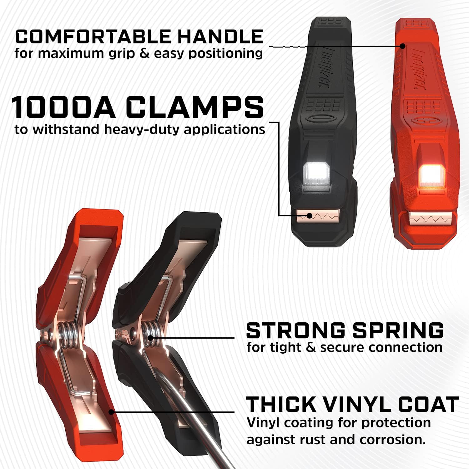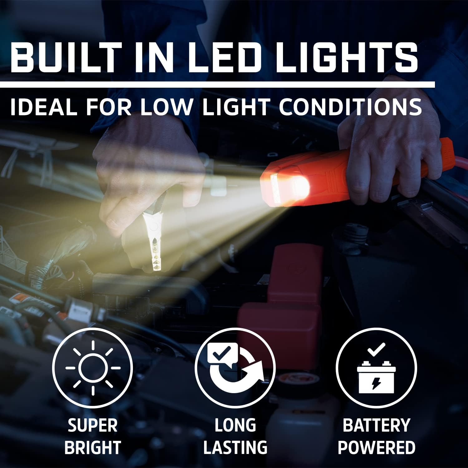 - BUILT-IN LED LIGHTS WITH REPLACEABLE BATTERY: The built-in LED Lights are the ideal solution when having to jump start a dead or weak battery in a dark, low light, environment. The LED lights automatically illuminate as soon as the alligator clamps open.
