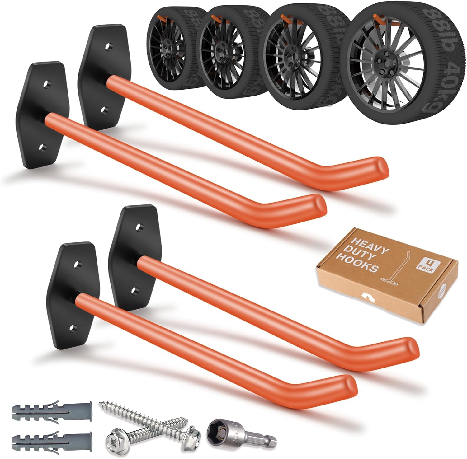 4 PCS Garage Hooks Heavy Duty Wall Mount, Tire Storage System with Anti-Slip Coating, Hang Heavy Tools for up to 88Lbs, for Bikes, Ladders, Chairs and Bulky Tools