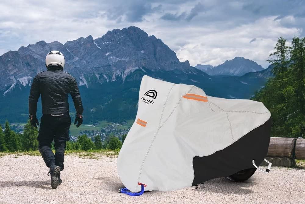 - All Season Waterproof & Windproof Protection: Coverado heavy duty motorcycle cover can handle it all no matter hot sun or cold weather. The strengthful material keeps your car safe from UV rays, snow, frost, rain, sand, dust, leaves, branches and birds dropping.