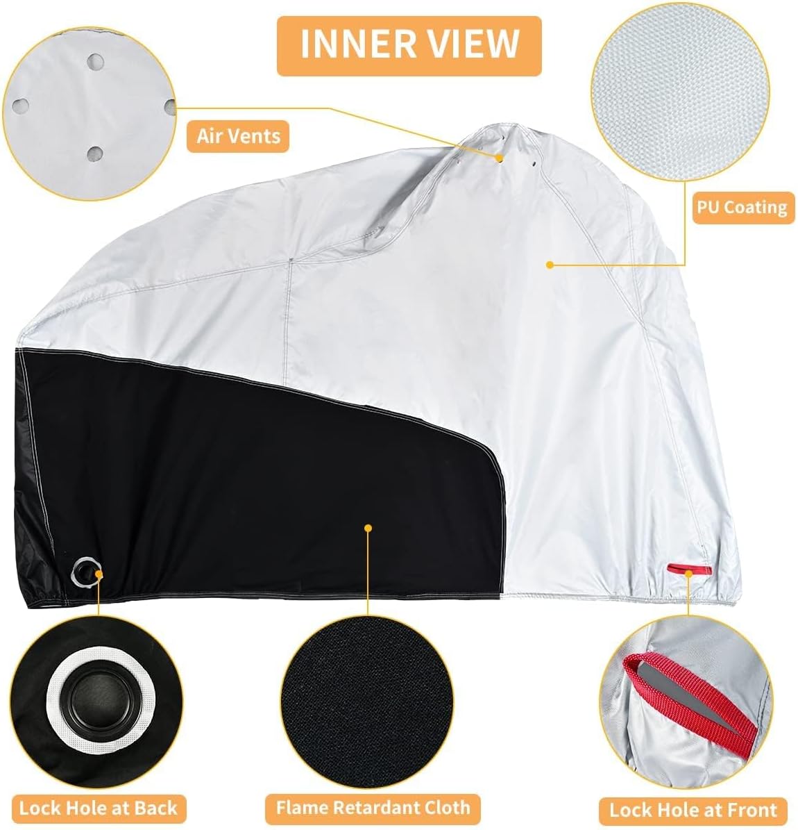 - Nice Design: 1. Heavy duty motorcycle covere quipped with 4 lock-holes totally, 2 at front and 2 at back, double security anti-theft. 2. breathable air vents to reduce moisture accumulation and allows for the circulation of air to keep the inside dry. 3. Motorcycle cover with reflective stripes to remind people in the night. 4. windproof strap with buckle in the middle to fix your motorcycle in heavy wind weather. 5. Large motorcycle cover comes with a portable storage bag to keep your cover