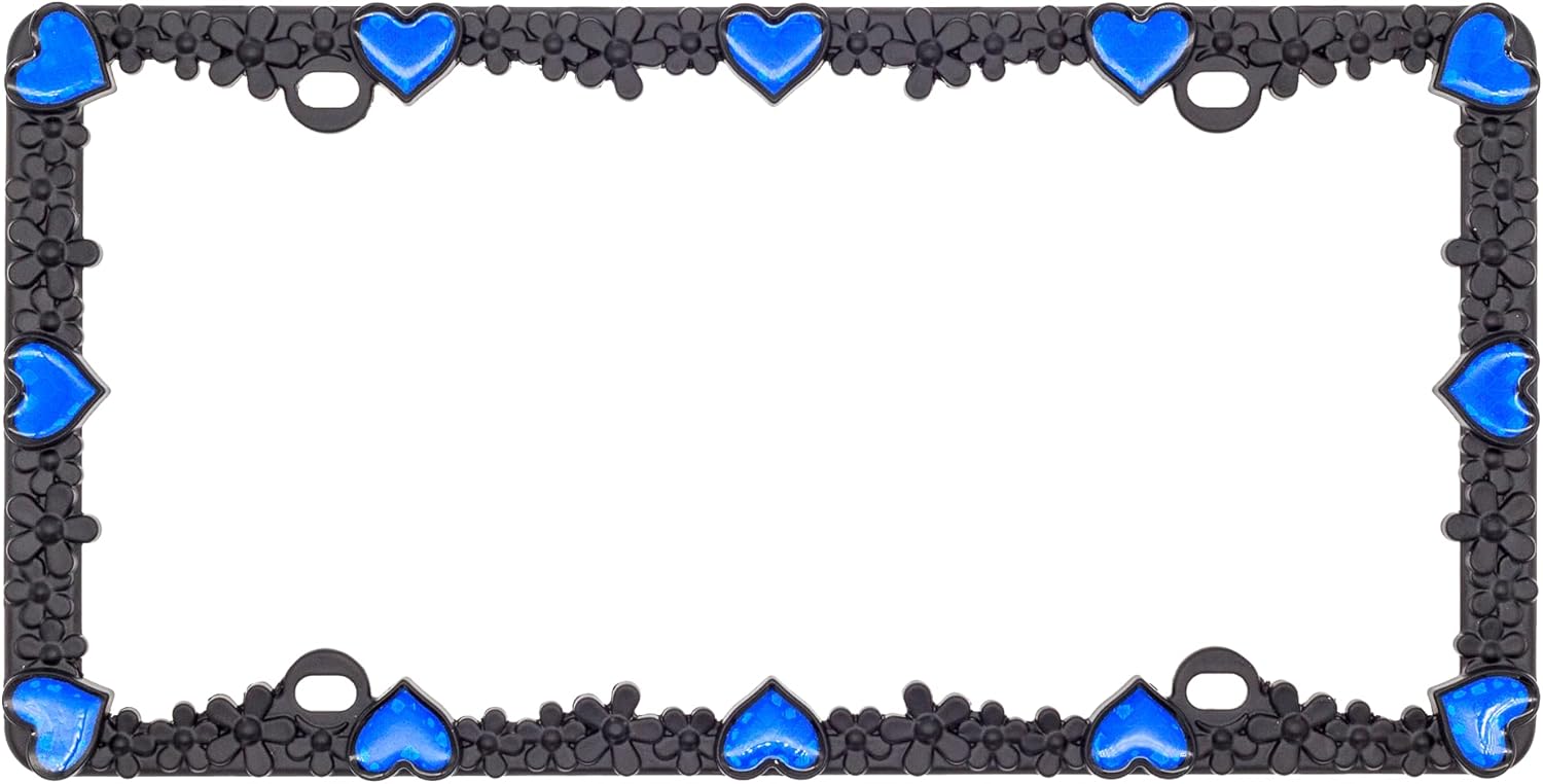 Creathome 3D Daisy Heart License Plate Frame from Pure Zinc Alloy Metal Perfect Plate Holder, Matt Black Daisy with Blue Reflective Heart