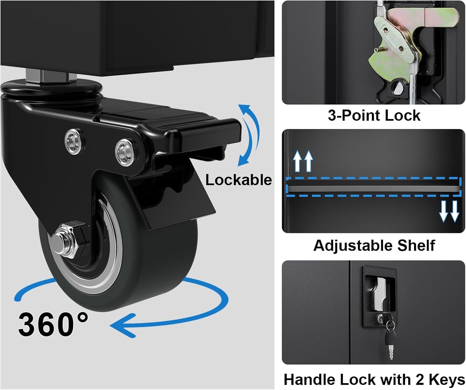 - 🛞【Mobile & Lockable Wheels】This small metal storage cabinet with wheels comes with four swivel wheels, allowing you to easily move it to your desired location. Additionally, the wheels can be locked to keep the cabinet fixed in place.