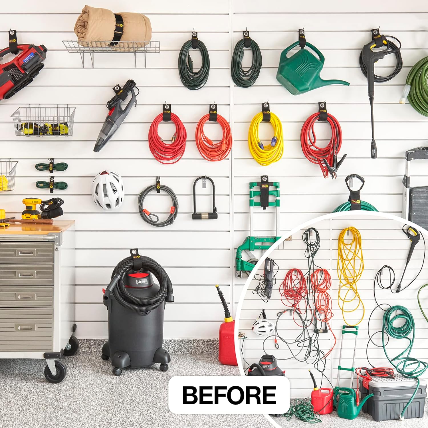 - Heavy-Duty polypropylene means high quality storage for garage accessories. More than just just an extension cord holder, these straps can hold up to 50 lbs. to handle heavy hoses and power tools.