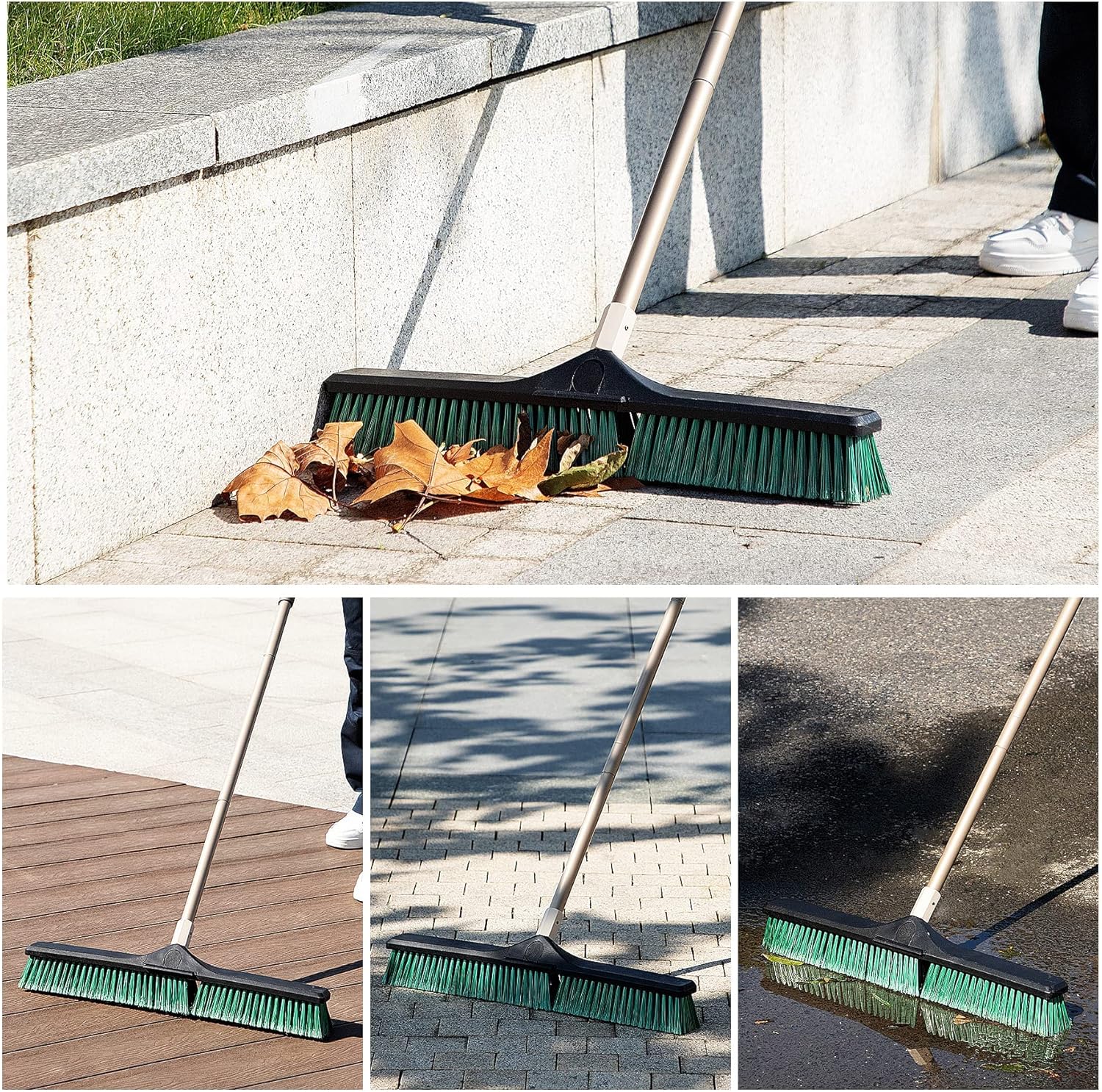 - 【2-Section Interlocking Broom Head】The 24 inches wide Double-layer Bristles broom could be used in both dry and wet floor condition, The 2-section interlocking convenient for storage the brush head, has soft outer green bristles that sweep up catch small fine dirt particles like dust, wooden chips, hair, while sturdy inner black bristles sweep away large debris or difficult to remove stains.