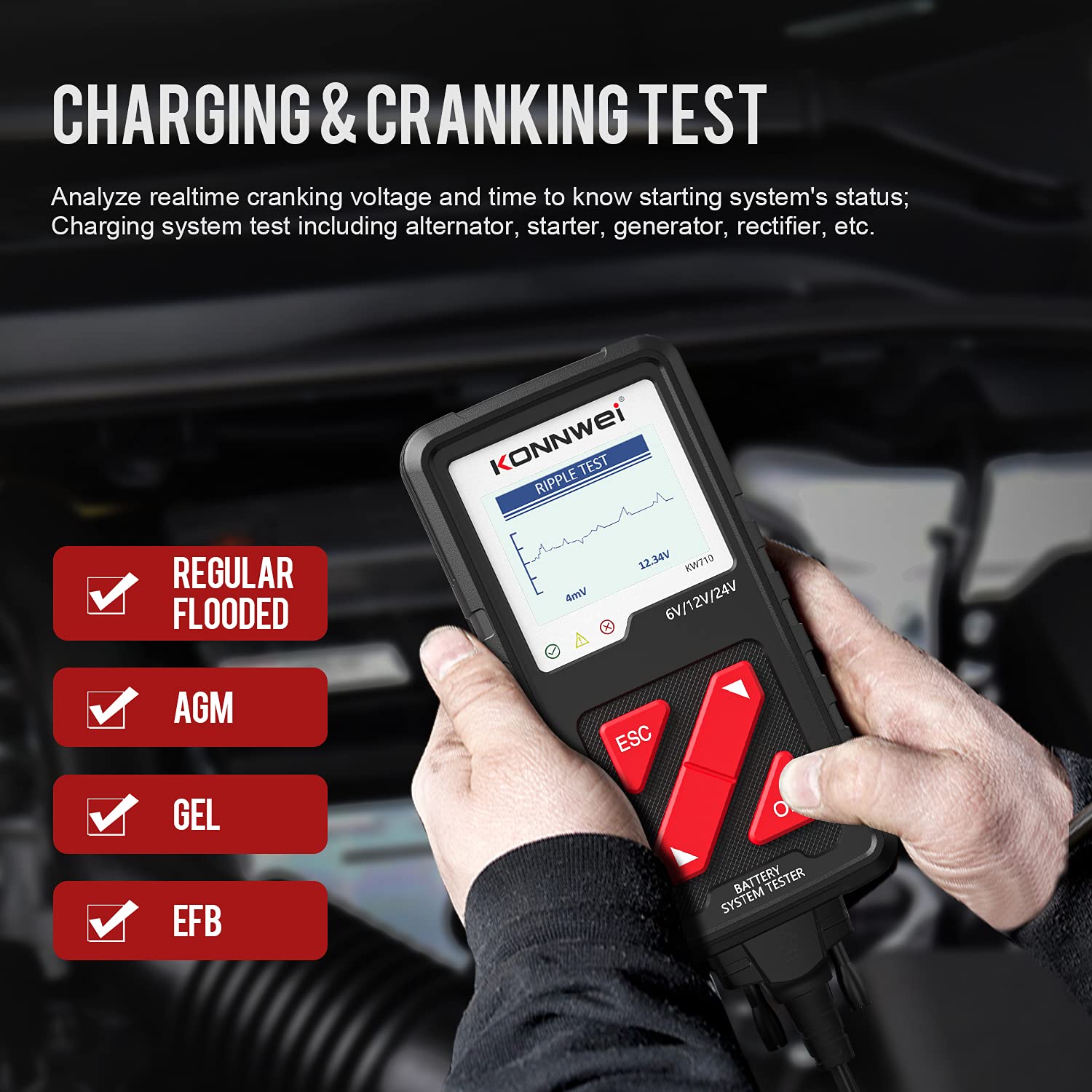 - 【CRANKING AND CHARGING SYSTEM TEST】 KW710 provides overall batteries data in milliseconds including voltage, internal resistance, cold cranking amp, battery health and charge status. Also can test 6V, 12V and 24V car charging system to make sure the output voltage of the generator is in a regular condition, the rectifier diode works fine and the charging current is normal status.