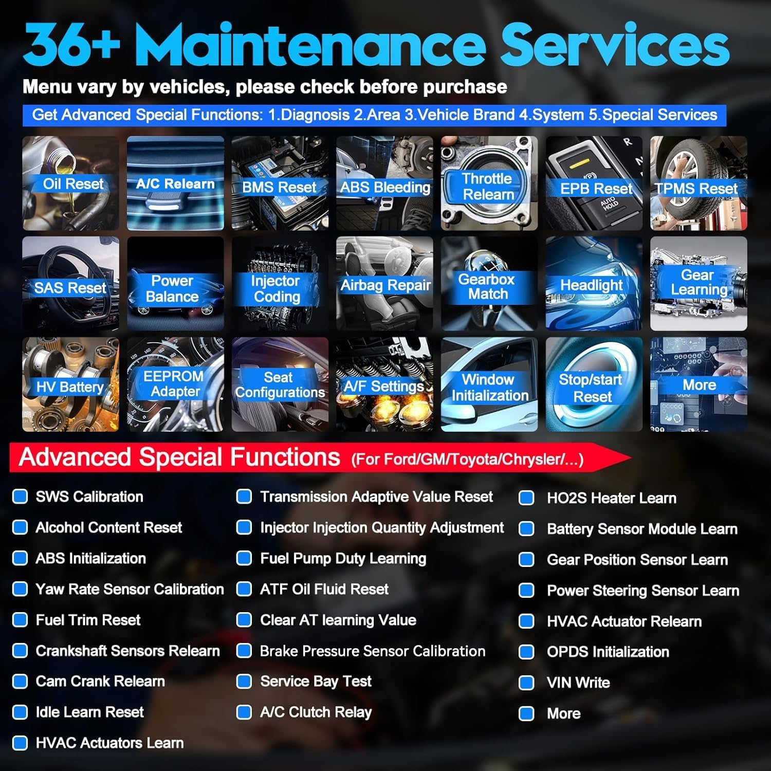 - 39+ Resets, Advanced Special Features : XTOOL D7W OBD2 Scanner diagnostic tool gives solution for Ford/for GM/for Chrysler/for Toyota/for BMW, etc. It includes Oil/EPB/TPMS/BMS/SAS/SRS/Throttle reset, ABS bleeding, Injector Coding, Power Balance. Additionally, it provides advanced diagnostic features under specific system menu, including Idle Relearn, VIN Write, Crankshaft Sensor Relearn, Fuel Trim Reset, ABS Initialization, etc.These features are highly practical for everyday vehicle maintenance, and performance optimization, making the tool ideal for both home DIYers and medium-sized workshops