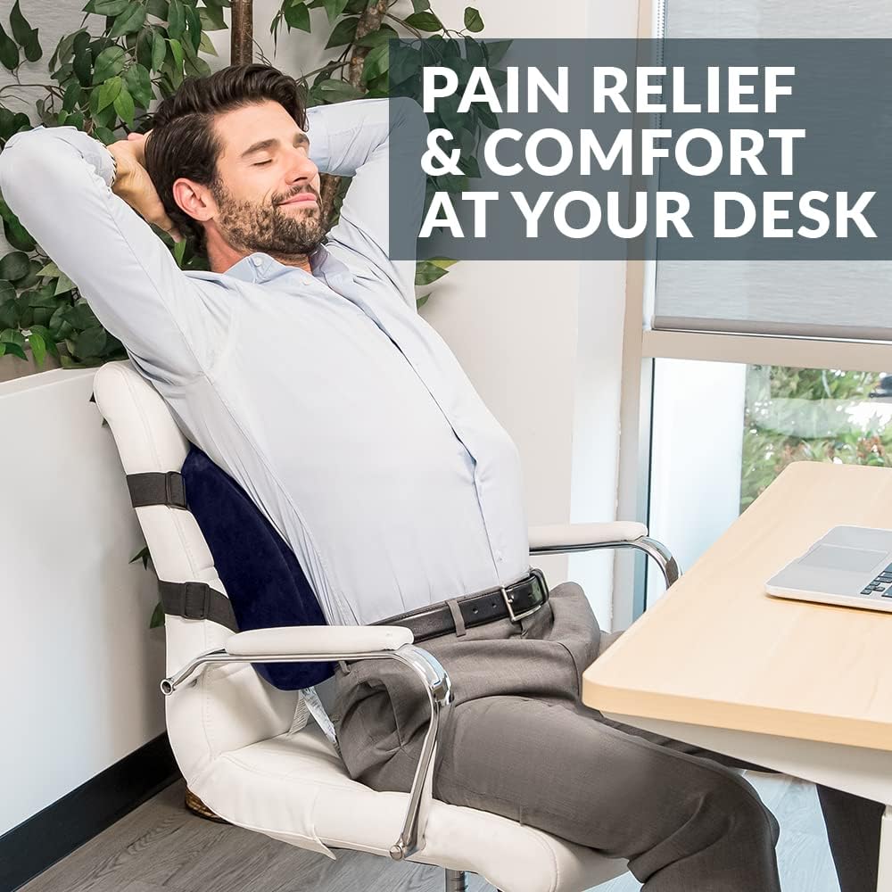 - Orthopedic Lower Back Support - Contoured memory foam cushion supports lumbar vertebrae discs and provides spinal relief. Helps maintain natural curve of lower spine as an office chair cushion, recliner or car seat cushion. This lumbar pillow is designed to help relieve pain while sitting and improve posture however it may not work for all conditions or completely eliminate all symptoms.
