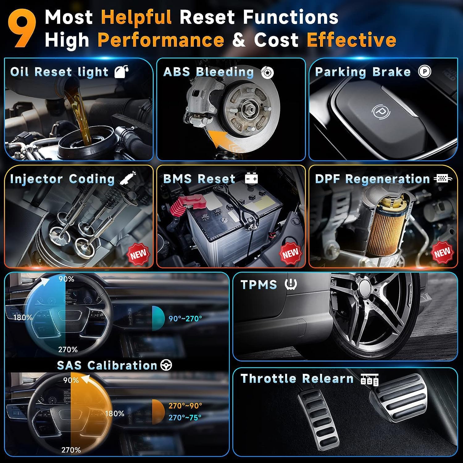 - 【9 Powerful Advanced Maintenance】The car diagnostic scanner delivers 9 powerful maintenance at no extra fee: ABS Bleeding for safe brake repairs, Oil Reset after oil changes, SAS Calibration for accurate steering alignment, TPMS Reset when replacing tire sensors, Throttle Reset for smooth idling, EPB Reset for brake servicing, Injector Coding for precise fuel delivery, D-P-F Regeneration for diesel maintenance, Battery Registration for battery replacement.