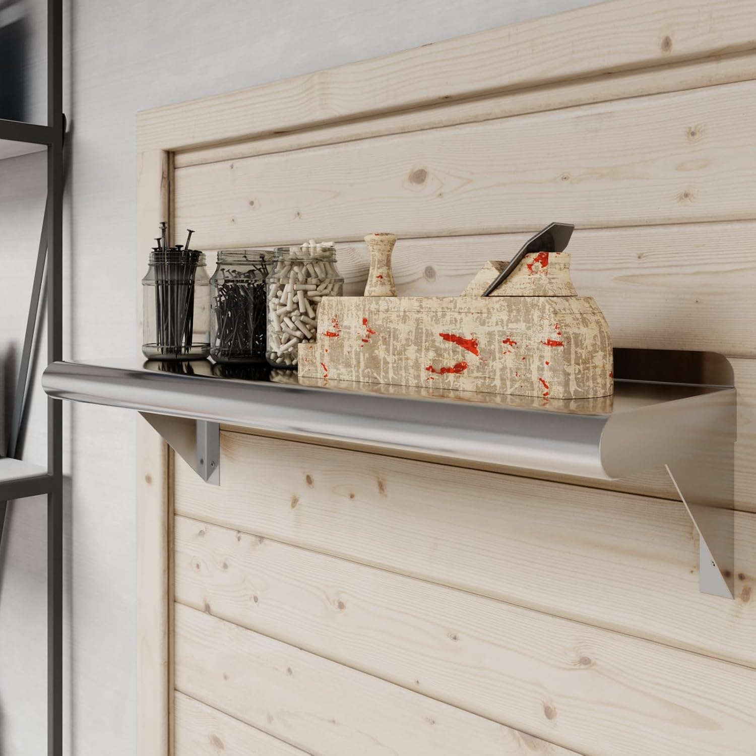 - 8 in. x 24 in. Stainless Steel Wall Shelf with 6 in. High Mounting Brackets. This heavy-duty multifunctional stainless wall shelf is made with 18 gauge stainless steel and can hold up to 165 Lbs of weight. The design features a 1 in. backsplash and bullnose edge. It's made with durable welded corners and support brackets.