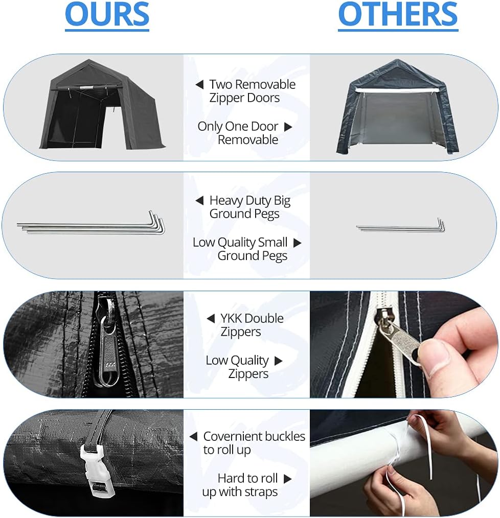 - 【Various Use】✔The portable storage shelter can be a motorcycle storage shelter, ATV storage shed, bike storage tent, or small vehicle garage shelter. It is also suitable for small lawnmowers, firewood or any other gardening tools.