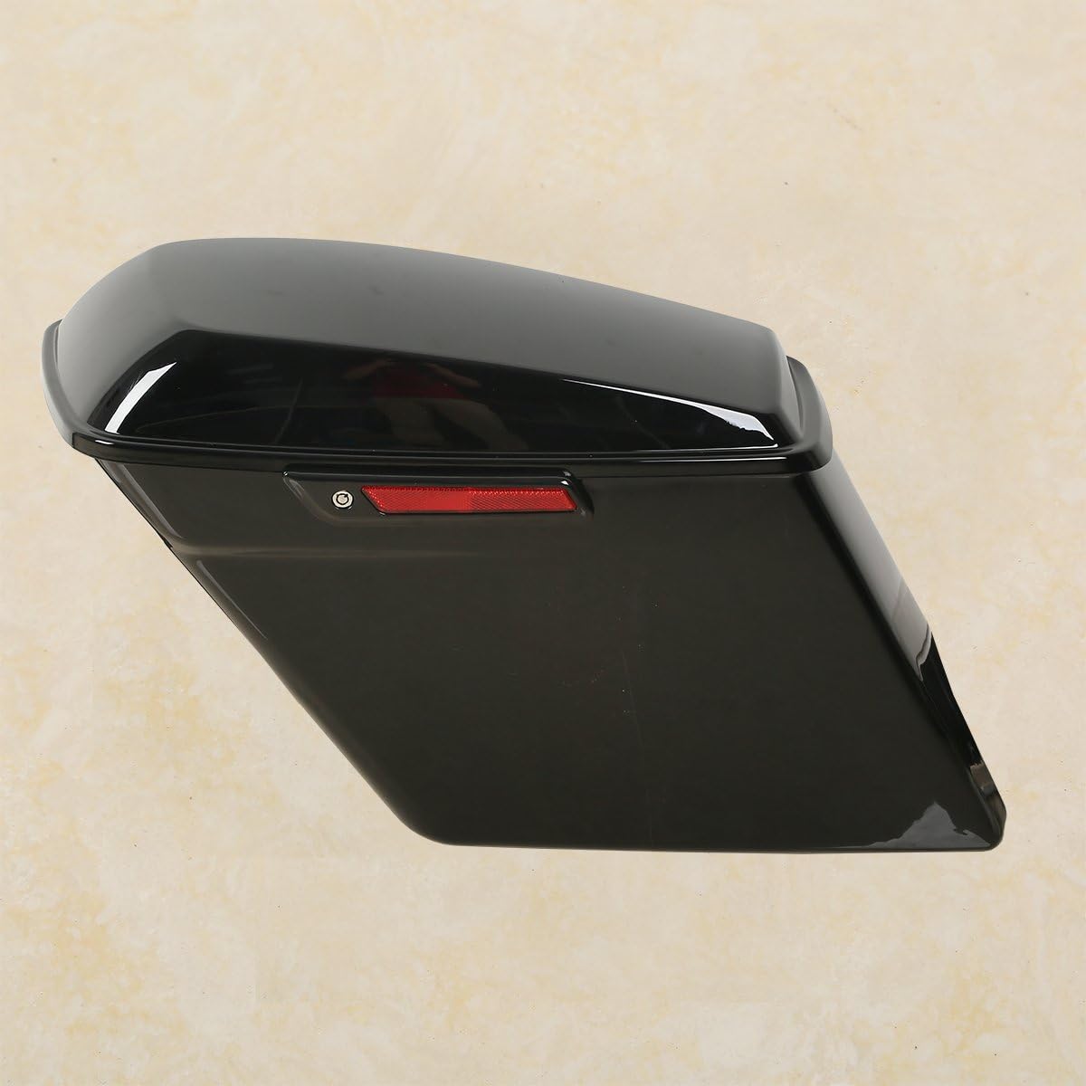 - Saddlebags Material: High quality ABS, Vivid Black finish; Latches Material: Zinc Alloy, Black finish; Saddlebags are stretched 5" longer than stock to cover the muffler front to back and give that stretched look