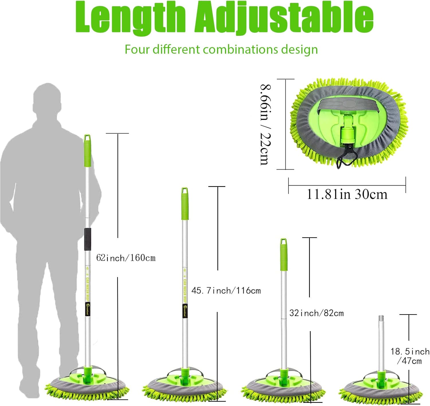 - 【Car Wash Mop With 62 inch Super-Long Handle】- Super-Long car wash mop will help you to clean the different height place where you can not reach by hand as the roof of the car. The car wash mop is made of aluminum alloy, which is harder than stainless steel, is lighter and has a longer lifespan! It can be extended to 62 inch, which ensures you can easily do a full cleaning.