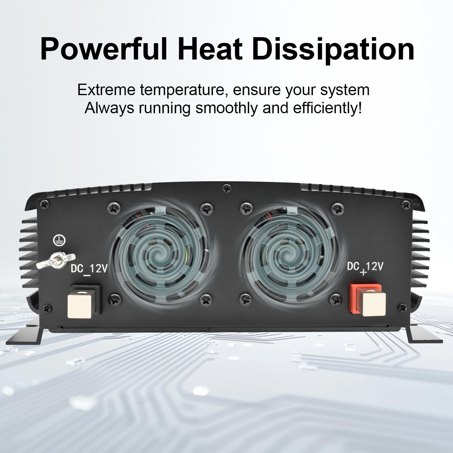 - 4.【Silent t& powerful cooling fan】: Being equipped with 3 powerful fans ,The 12 volt car inverter can realize fast heat dissipation. Its smart cooling fan system only works when the device gets warmer or output power exceeds, slows down and stops working when the temperature gets down. making the truck inverter work silently most of time.