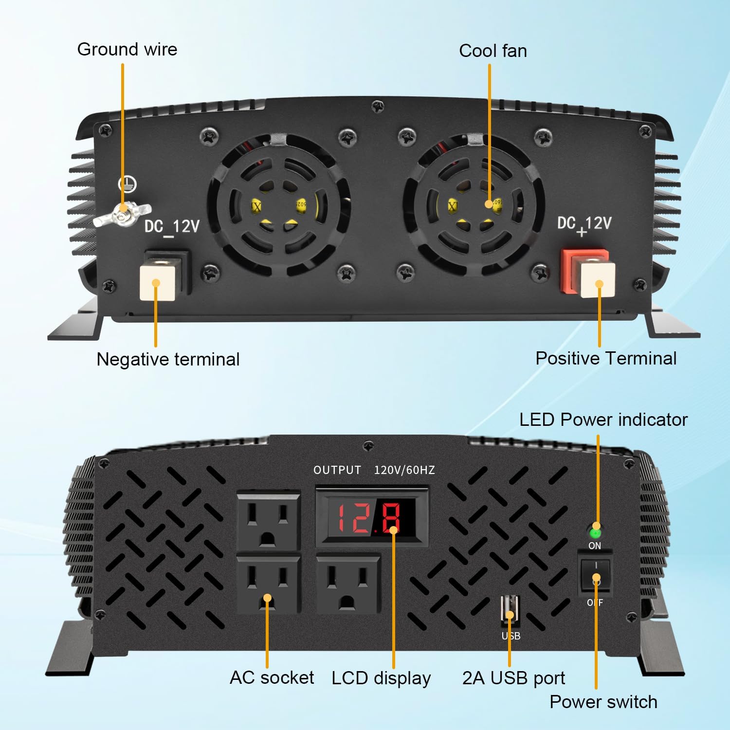 - 3.【LCD Display】: The inverter 12V to 110V has an updated LCD screen showing the real-time battery status constantly. Monitoring and alarming when battery in under voltage or over voltage.