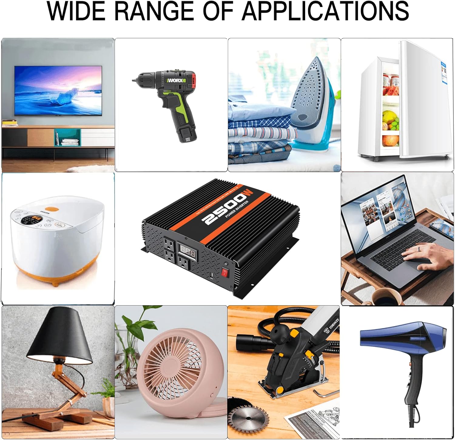 - 2.【Safe charging technology& Stability】: This 2500W inverter has 10x30A built-in fuses to protect the inverter and your device from short circuit current ; Its stable charging technology protect the 12V car inverter against overheating, under and over voltage charging, short circuiting, overloads, and overcharging.