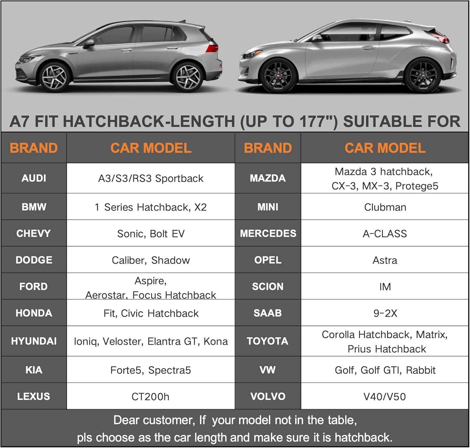 - 【Dimension A7】— Universal fit for hatchback which length is up to 177 inch (NOT FOR SEDAN AND SUV). Suitable for VW Golf/Gti/Rabbit, Mini Clubman,Toyota Matrix, Honda Fit, Bmw 1 Series/X2, Lexus CT200, Hyundai Veloster, Ford Focus hatchback, Chevy Bolt, Chrysler pt cruiser, Audi A3 hatchback etc.