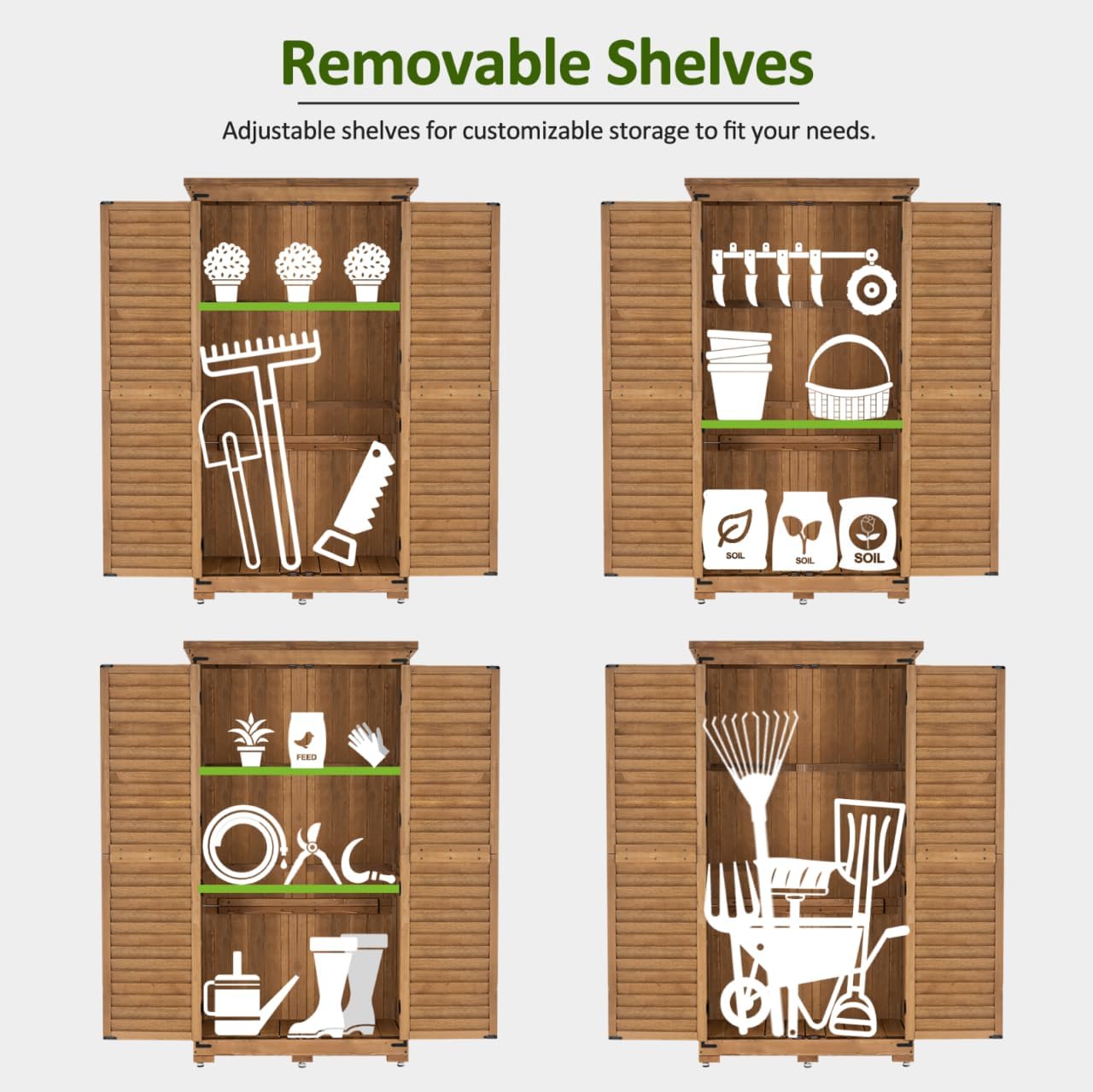 - Fir Wood Material: The vertical storage shed is made of high-quality fir wood, and the exterior has been polished to express a rustic style. Besides, the wooden shed is easy with other décor and natural settings.