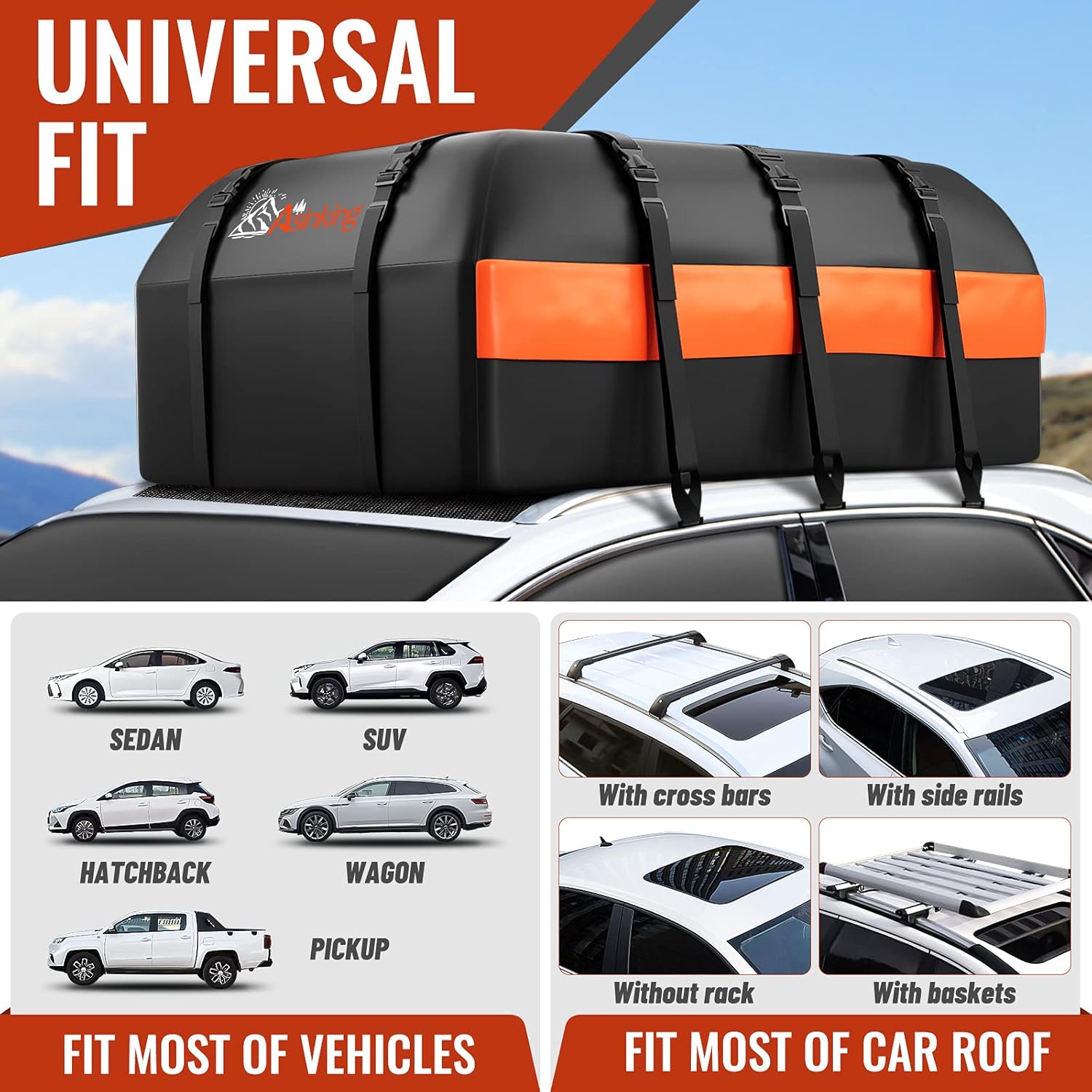 - [SECURE FIT & LARGE CAPACITY] Our 15 cubic feet rooftop cargo bag is compatible with vehicles with our without roof rack, the large capacity can keep the shape nicely, even when holding many luggage cases, blanket, tents, sleeping bags and more.