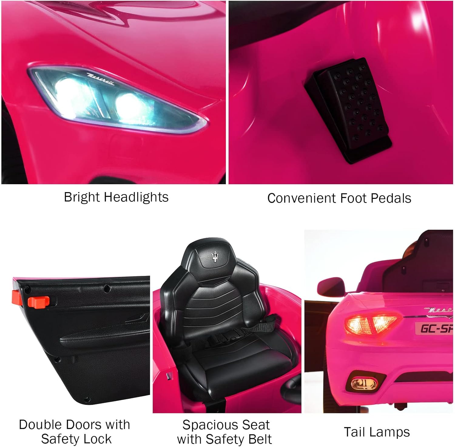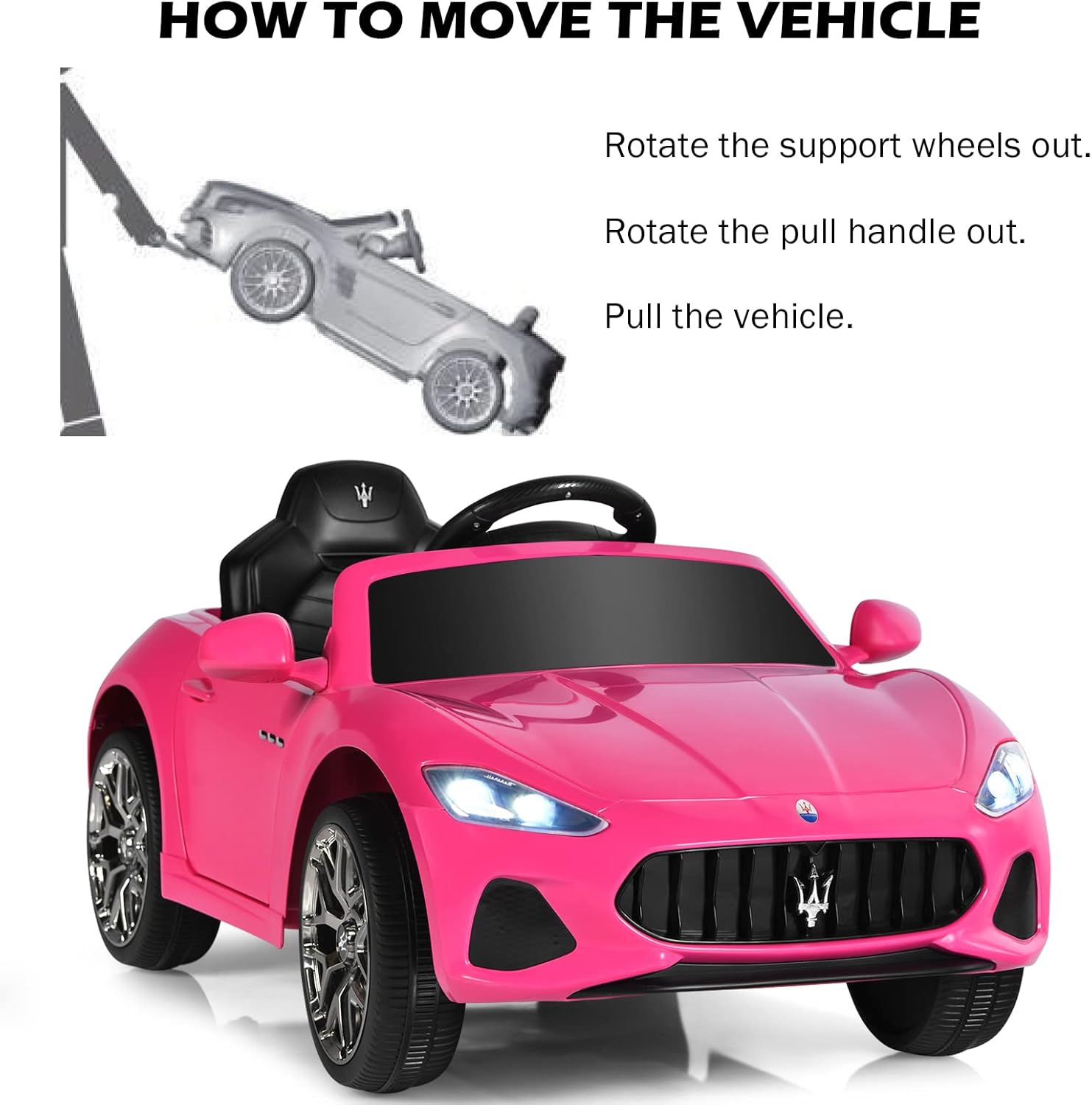 - [Perfect Gift for Any Child]: Real Maserati appearance makes it a real eye-catcher. Our electric car for kids is a perfect gift for children' birthday and Christmas. Ergonomic and spacious seat offers kids a large sitting space. Front handle and 2 support wheels enable you to easily move the pink car when the battery runs down.