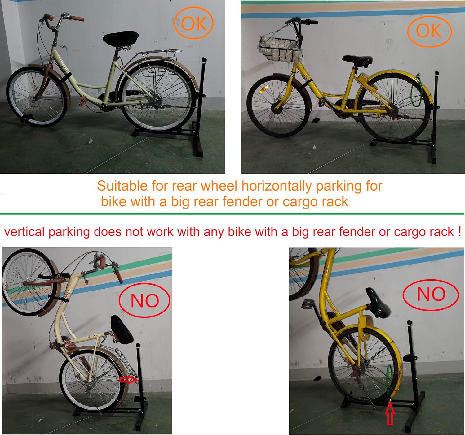- OPTIMIZED DESIGN - The bike rack with easy-to-use upright design takes the effort out of lifting and hanging heavy bikes to saving space in your house for cyclists. This bicycle stand can be adjusted to a variety of heights 18’’-32’’,For Wheels up to 2.3" wide and up to 70 pounds Weight bike,Suitable for rear wheel level parking for most bicycles,But used for vertical parking does not work with any bike with a big rear fender or cargo rack or wide/heavy fat tires.Small rear fender can be used.