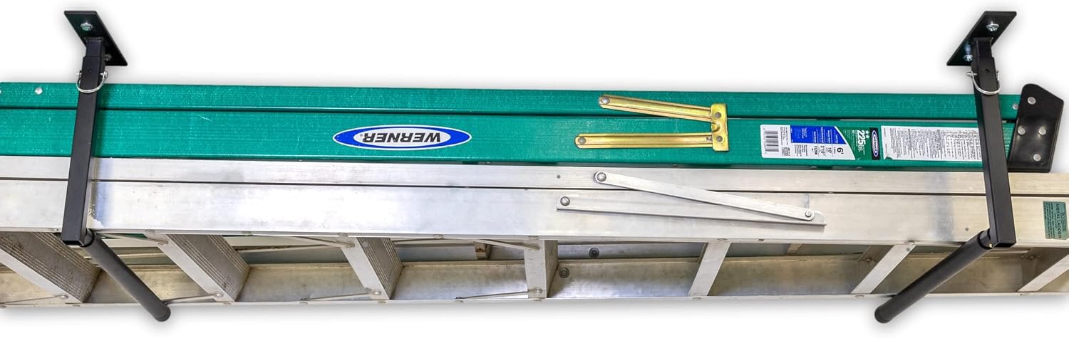 - INDOOR LADDER STORAGE: Utilize overhead storage space in your garage, shed, or basement with this innovative ladder storage rack. Holds most foling ladders, step ladders, telescoping ladders, and extension ladders.