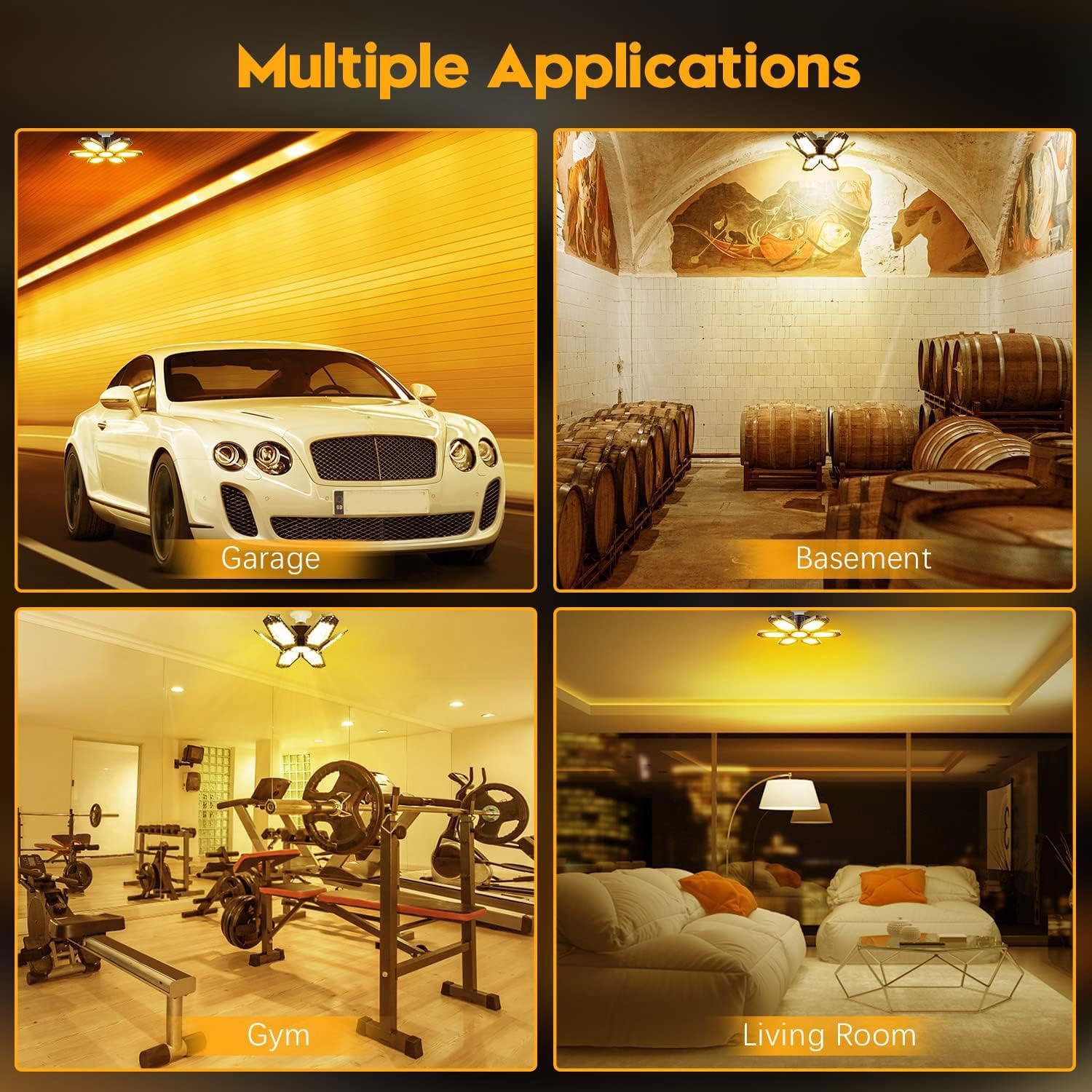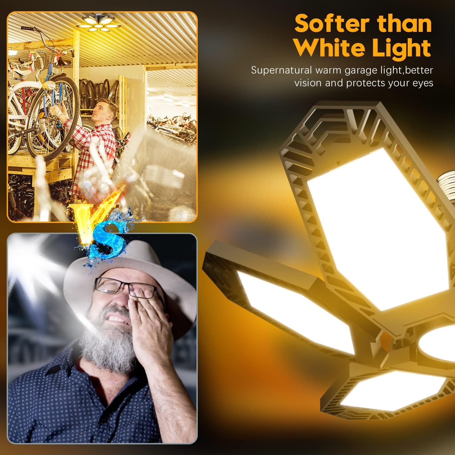 TANBABY 2 Pack Garage Light Warm 150W Led 3000k Garage Lighting 12000LM [Equivalent] Deformable Garage Light Ceiling with 6 Panels E26/E27 Base Illuminator 360 Basement Lights for Shop