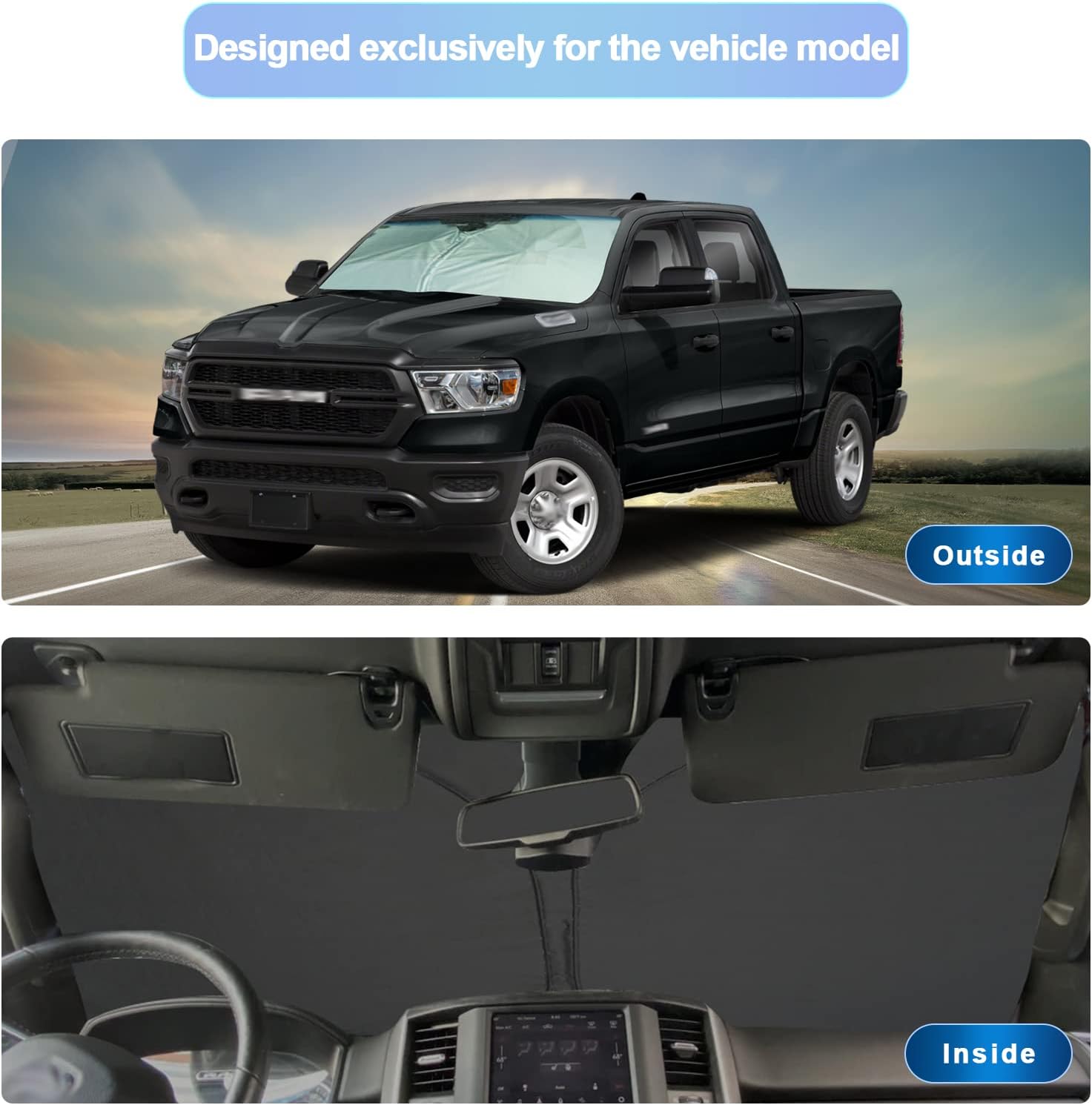 - 1.Custom Fit: this windshield sun shade is custom designed for 2019 2020 2021 2022 2023 2024 Ram 1500 sunshade for front window.You don’t need to worry about oversize or too small,consider it if you need a car protector cover that protects your car interior from sunburn.