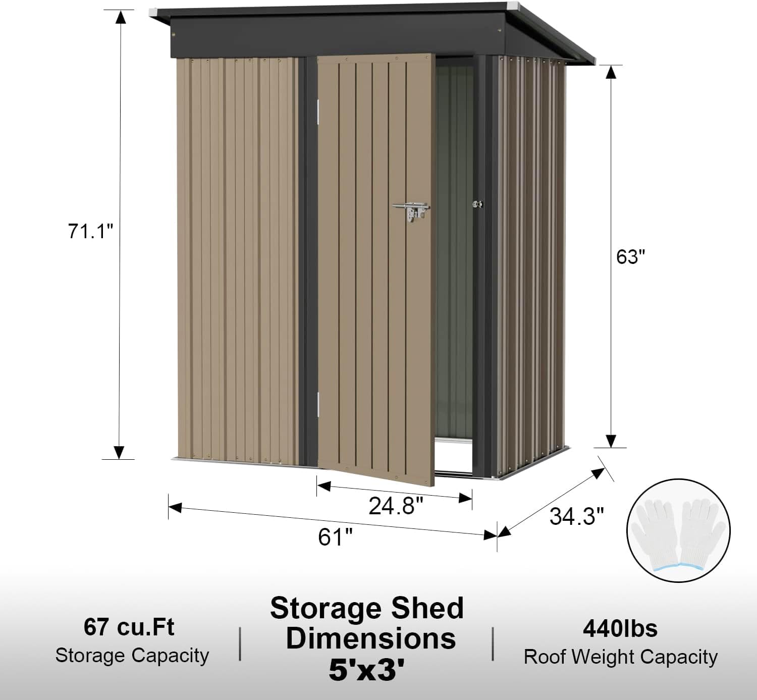 - [Humanized Design] The height of the storage shed door is 61.4", which can be freely entered and exited with the head slightly lowered. It can be used as a bicycle shed. There are latches on the doors, which can be locked to avoid property damage. There are ventilation holes in the front of the roof to maintain air circulation.