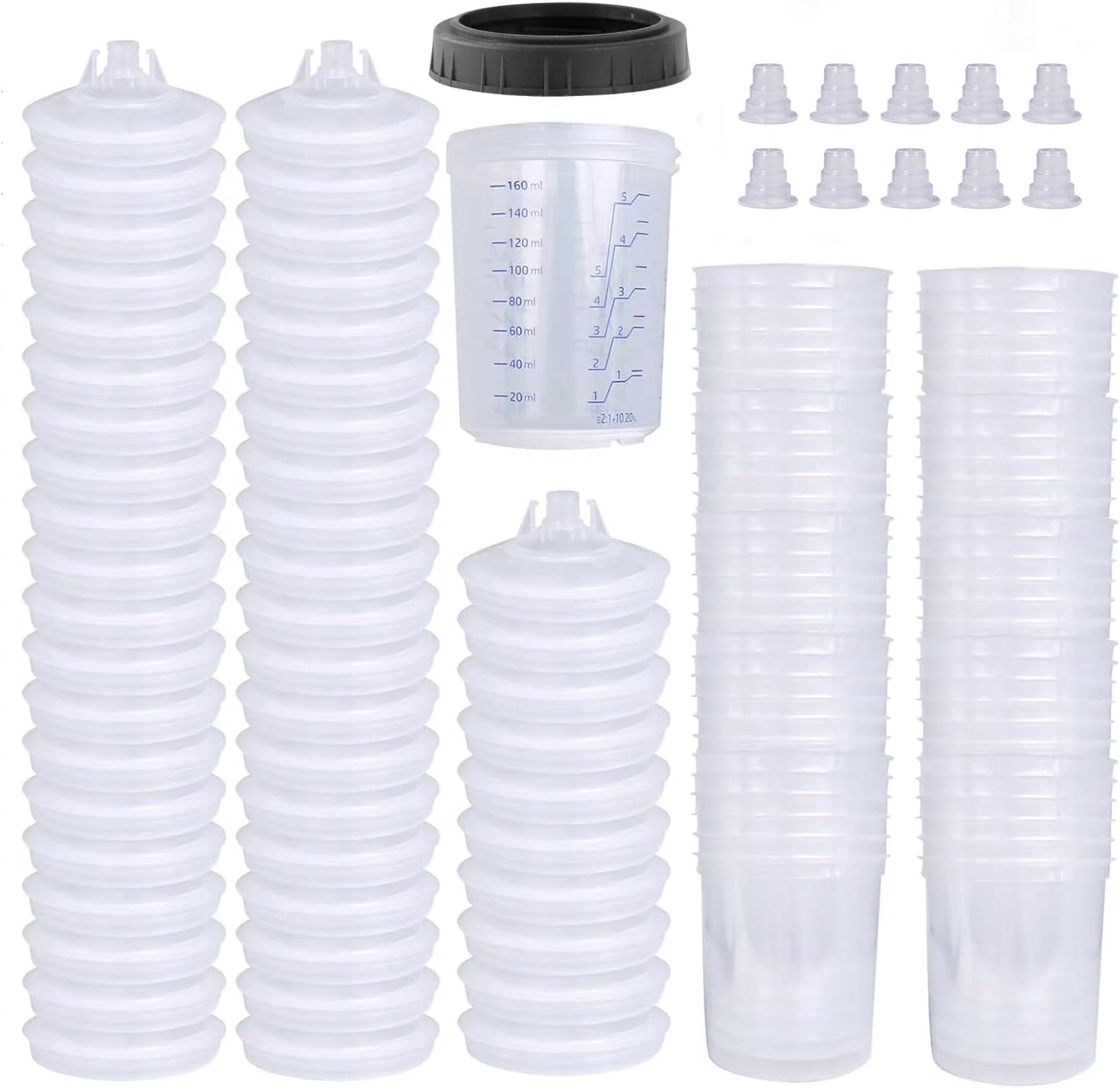 Disposable Paint Sprayer Mixing Cup for Automotive Paint Gun, HVLP Paint Spray Paint Gun 6 Ounce (160ml) Kit with 50 Cups and Lids System, 1 Hard Cup with Retainer Ring and 10 Plugs