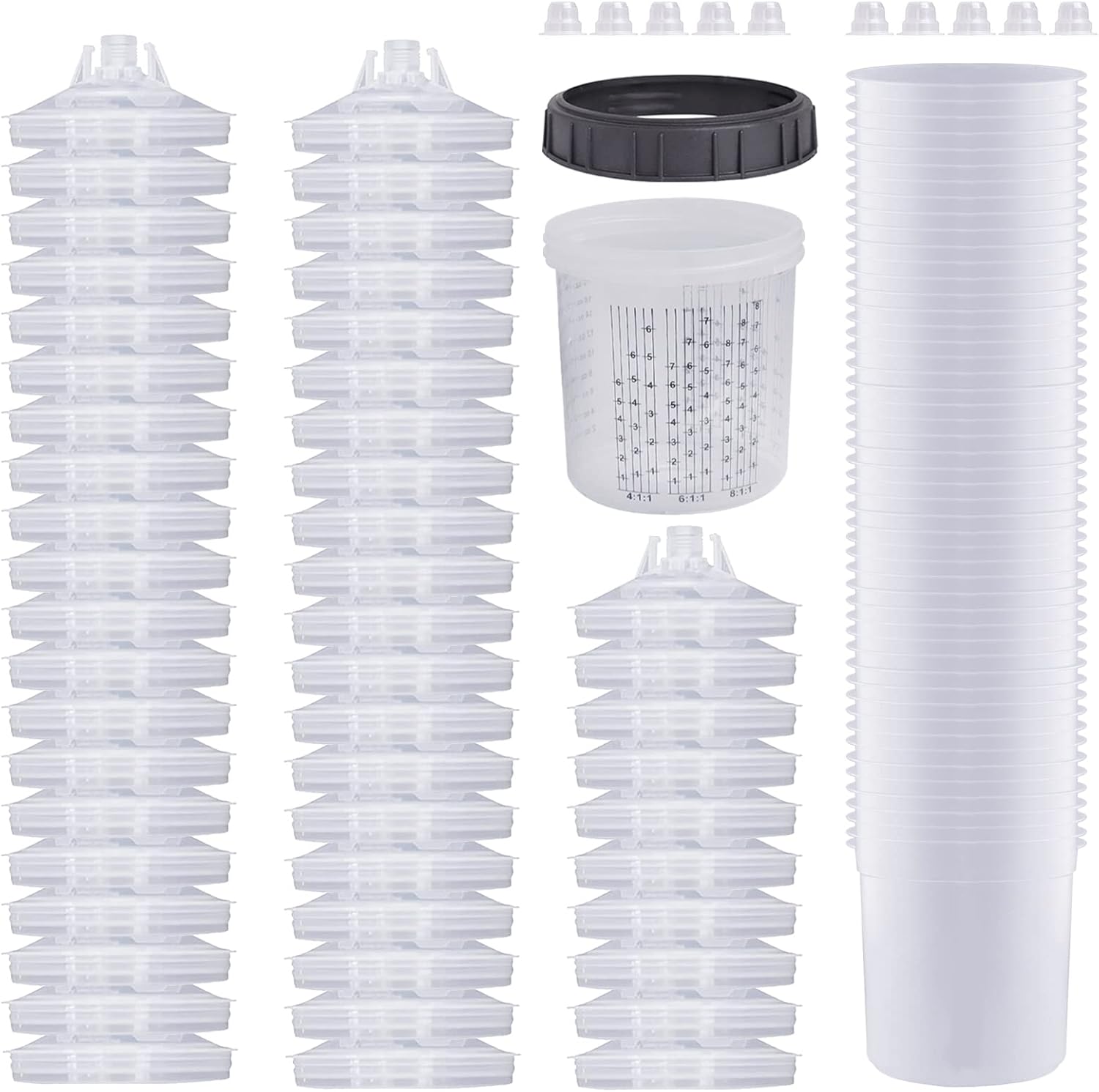 Disposable Paint Sprayer Mixing Cup for Automotive Paint Gun, HVLP Paint Spray Paint Gun 20 Ounce (600ml) Kit with 50 Cups and Lids System, 1 Hard Cup with Retainer Ring and 10 Plugs