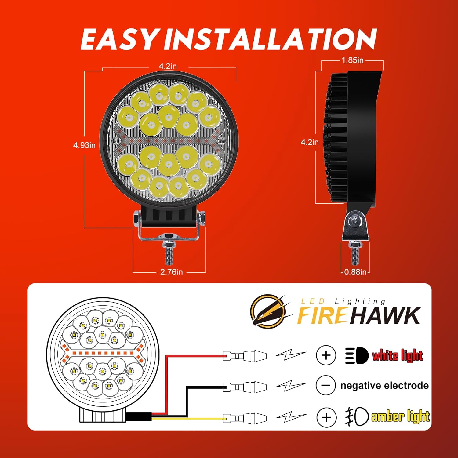 Firehawk LED Light Pods Bar 4 Inch 30000LM 60W Round Spot Flood Amber White Driving Offroad Fog Work Backup Bumper for Truck Jeep ATV UTV SUV Tractor Motorcycle 4x4 Cart Trailer Boat Waterproof 2PCS