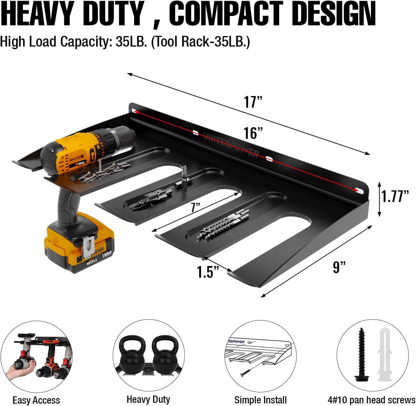 - Space Saver: Our power tool organizer wasted wall space into a compact & efficient power tool storage and display area. Three dishing trays on the rack for accessories, allowing screw driver, drill bits and bolts with in. Save more storage space for workshop, shed etc