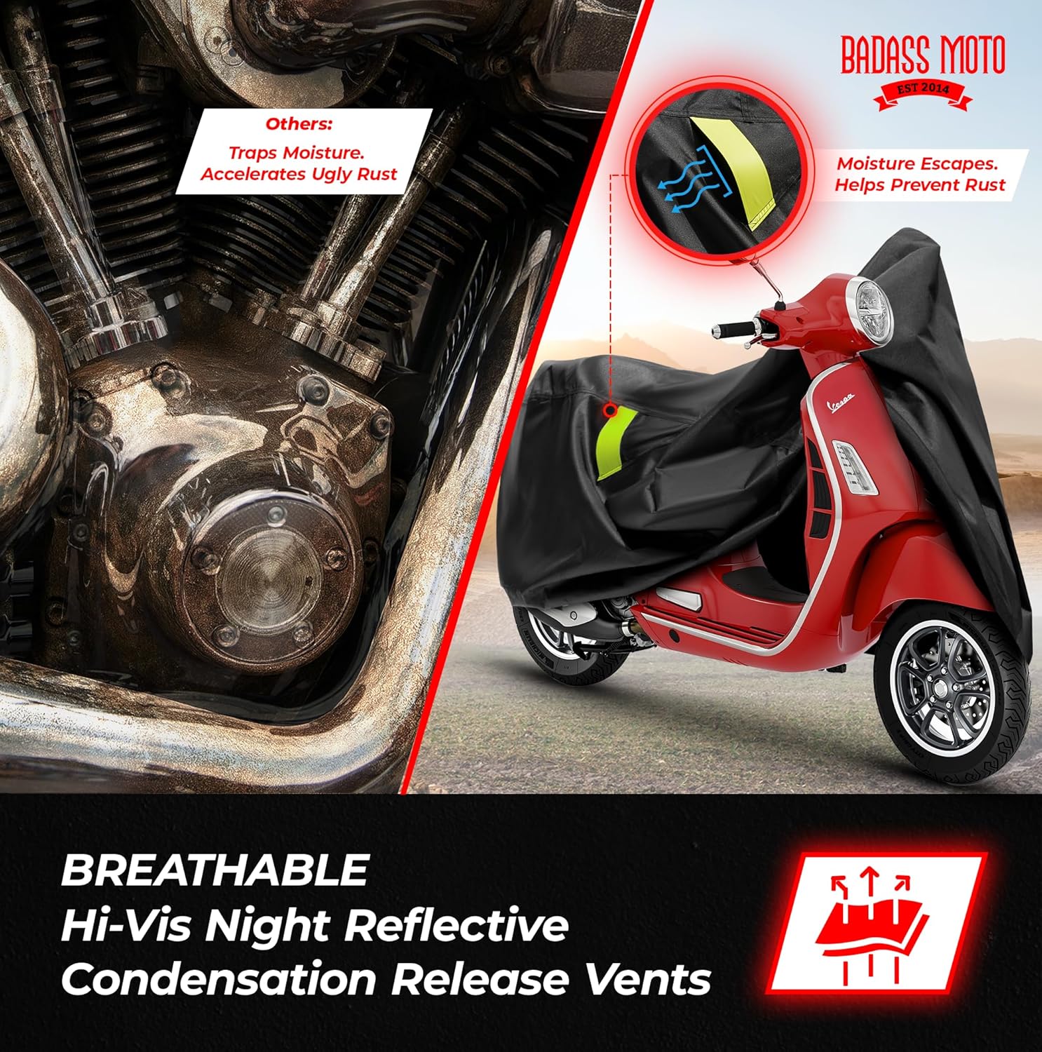 - SOLVING WEATHER DAMAGE PROBLEMS – Tired of your scooter getting dirty and wet? The Badass Moto Ultimate Scooter Cover provides an ultimate motorcycle cover waterproof outdoor solution for a scooter piaggio that is clean, dry, and ready to ride. No more dealing with dirt, grime, or water damage. Protect your investment with a cover designed to fit perfectly and keep the elements out.