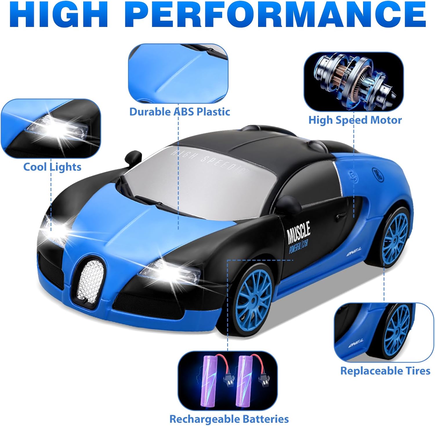 - Rechargeable Fast Car: Full function RC drift car with two rechargeable batteries. Don't worry about being out of charge anymore; Forward, reverse, left/right turn, front LED lights, U shaped drift, fiqure 8 drift, all-wheel drive