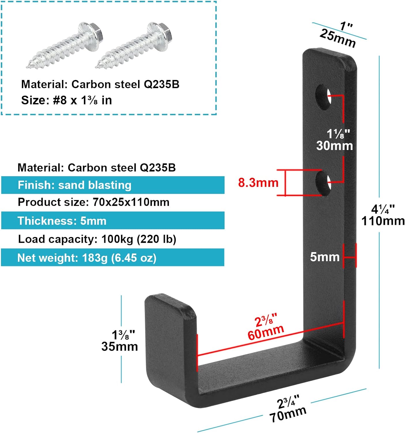 - Package Content: 4 x steel Wall Hooks, 8 x Mounting Screws