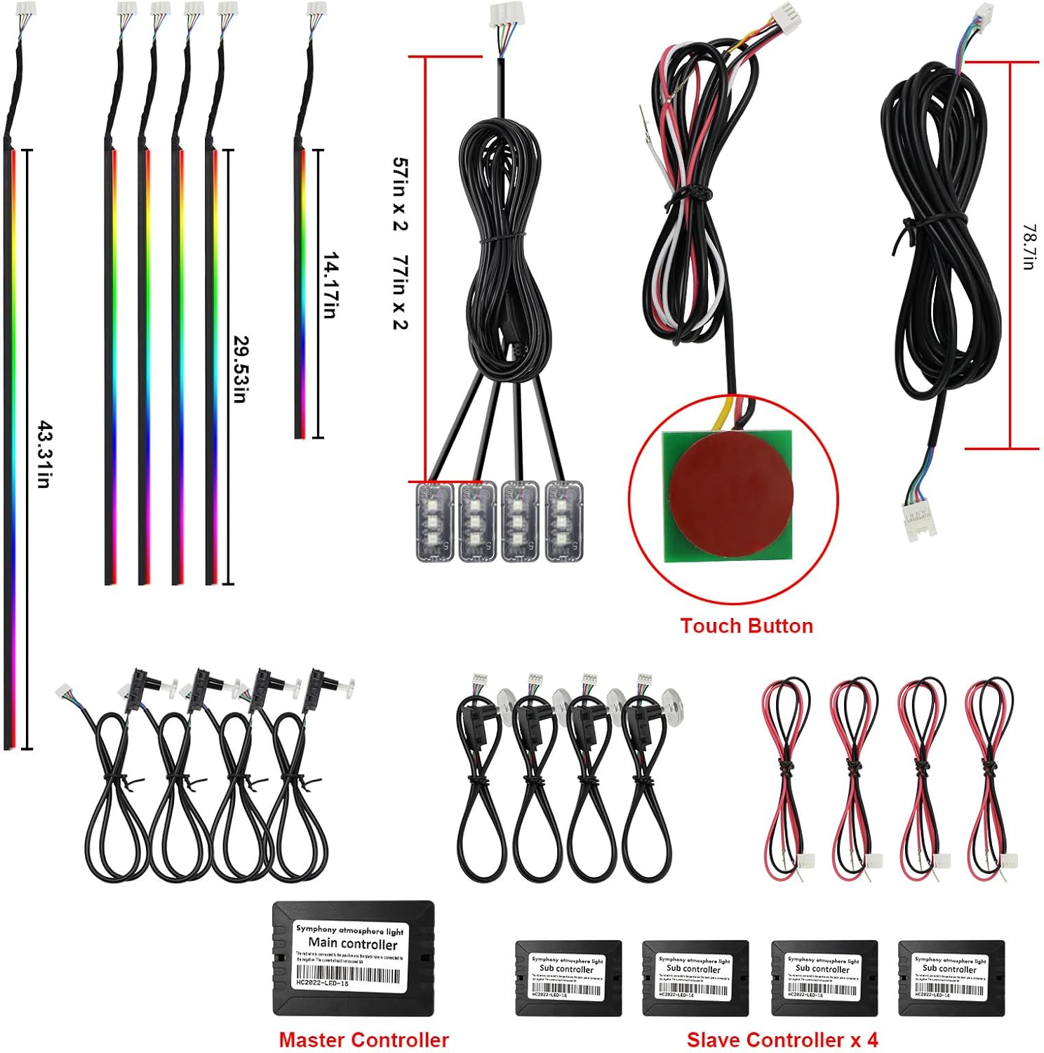 - 【RGBI Dreamcolor 18-in-1 Car Ambient Light】 This interior car LED light consists of 6 acrylic fiber optic light strips(175-inch 593 LED lights) , 4 under dash lights, 4 door handle light and 4 door storage box light, and has one master controller and 4 sub controller, which can be flexibly installed in any car without clutter. The dreamcolor lighting effect of the upgraded RGBIC can bring you a different experience.