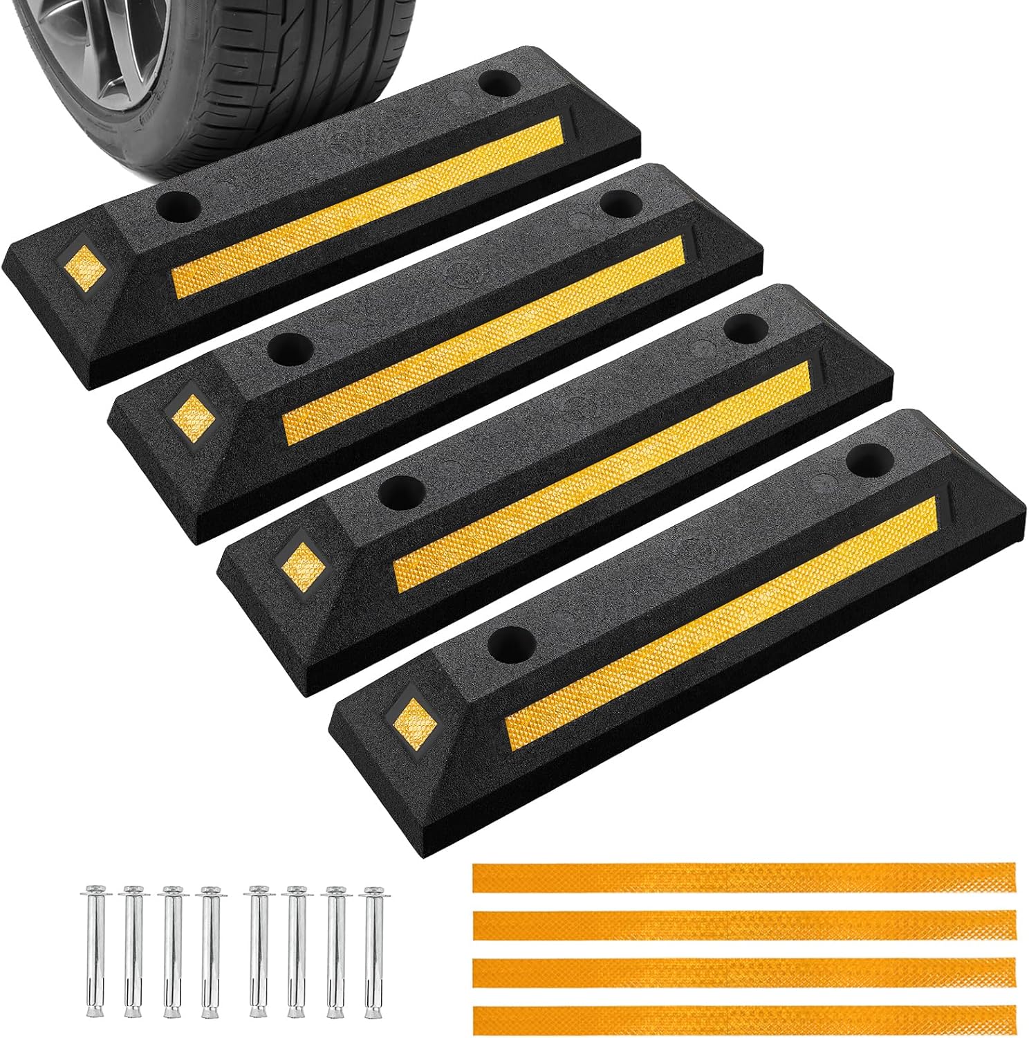 4 Pack Rubber Parking Guide Blocks | Heavy Duty Black Parking Blocks Parking Target Guide with Yellow Reflective Stripes, Wheel Stop Stoppers for Car, Truck, RV, Trailer, and Garage (4 Pack)