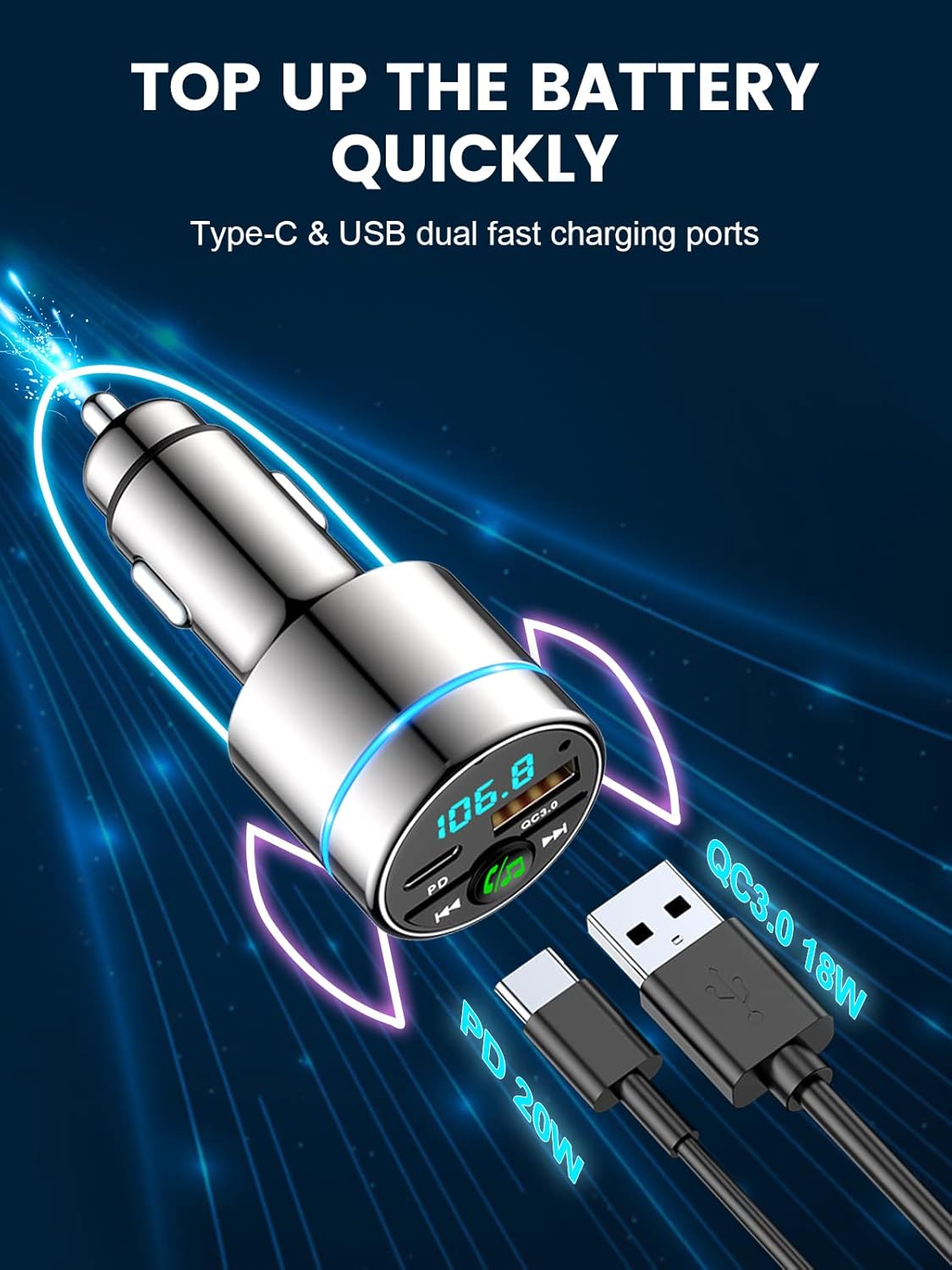 - 【LEVER UP YOUR DRIVING EXPERIENCE】 It helps to monitor car voltage, and features blue ring light around the shell, which is useful for quickly finding it in the dark and provides some necessary flair to your car. This Bluetooth FM transmitter streams any audio from your phone to the car system, including navigation and voice assistant, bringing your old and vintage car to a new lever
