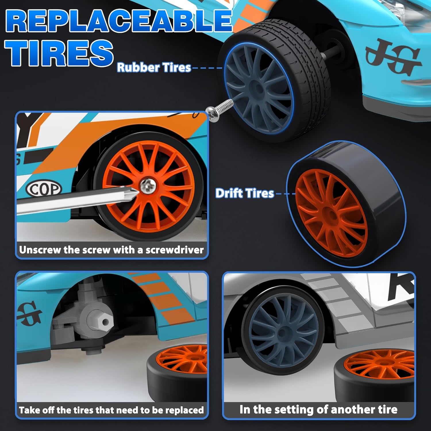 RC Drift Car 2.4GHz 1:24 Scale 4WD Remote Control Car 15KM/H High Speed Drifting RC Cars with Cool Lights, Two Batteries and Extra Tires Toys for Kids Boys Girls Adults, Blue