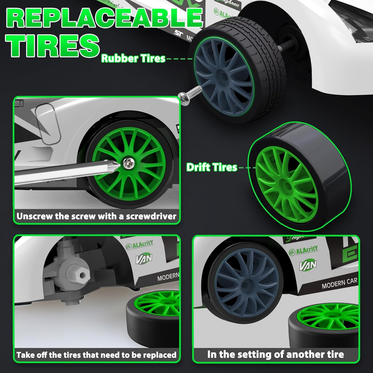 Remote Control Car 2.4GHz 1:24 Scale 4WD RC Drift Car 15KM/H High Speed Drifting RC Cars with Cool Lights, Two Batteries and Extra Tires Toys for Kids Boys Girls Adults, Green