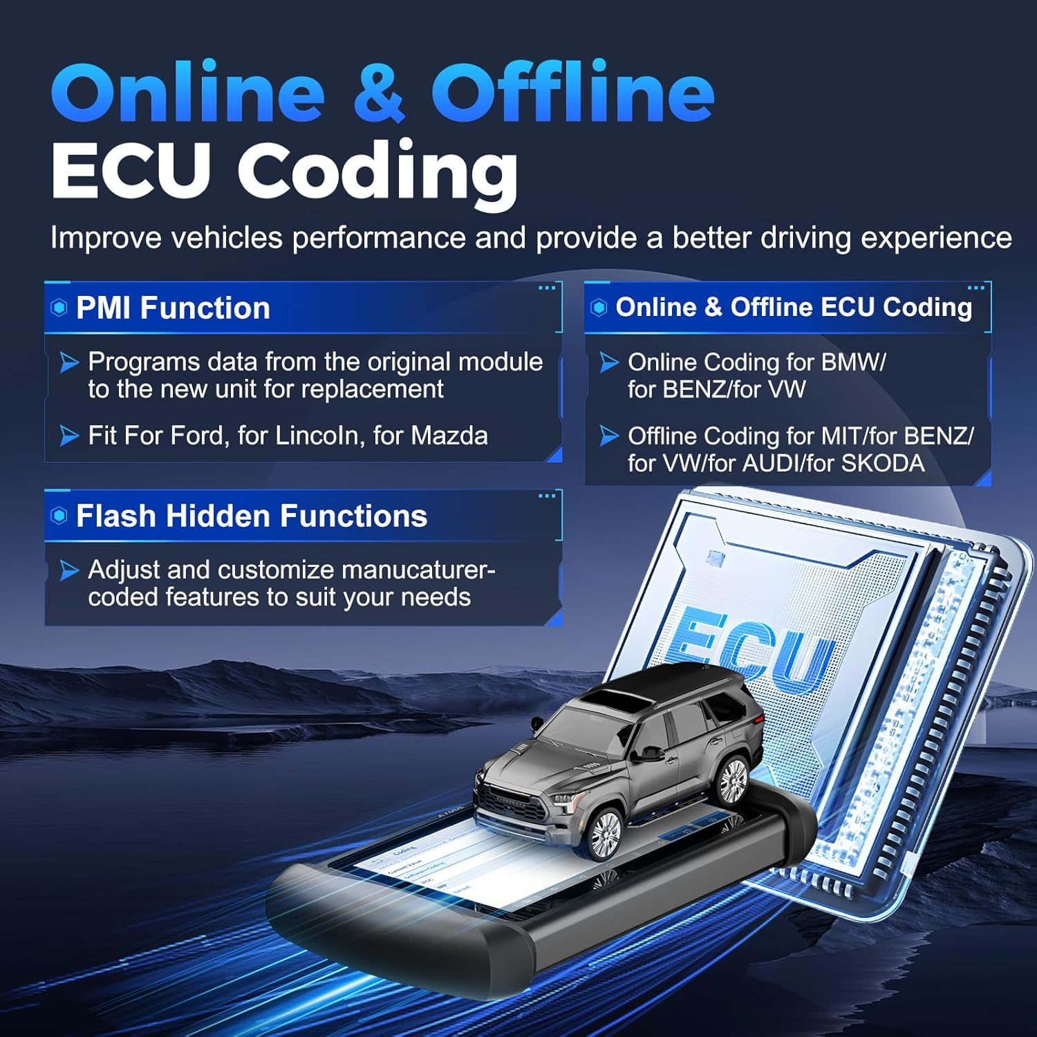 - Master Module Programming & ECU Coding: Featuring PMI function for Ford, for Lincolin and for Mazda vehicles, allowing you program new modules quickly and correctly, saving valuable shop time. ECU coding helps you reset adaptive data, match/relearn replaced ECUs for BENZ, and for Mitsubishi. This professional diagnostic scanner delivers the precise module programming and coding functions needed for complex repairs, becoming your indispensable automotive repair assistant.
