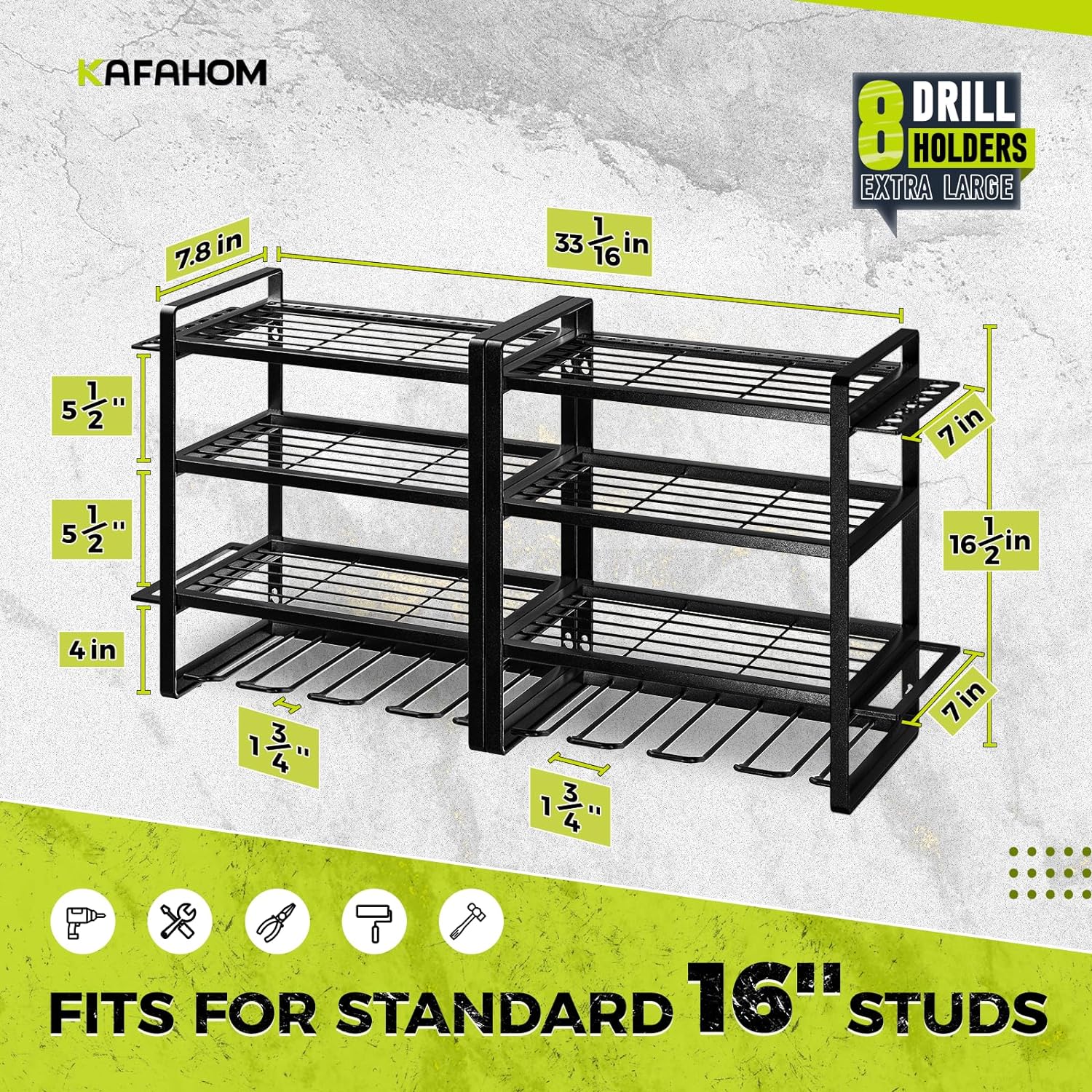 KAFAHOM Power Tool Organizer Wall Mount, 4-Tier Drill Holder for Cordless Tools, 2-Pack Set, Garage Storage Rack with Side Hooks for Hammers & Pliers, Tool Organizer for Workshop/Utility Room