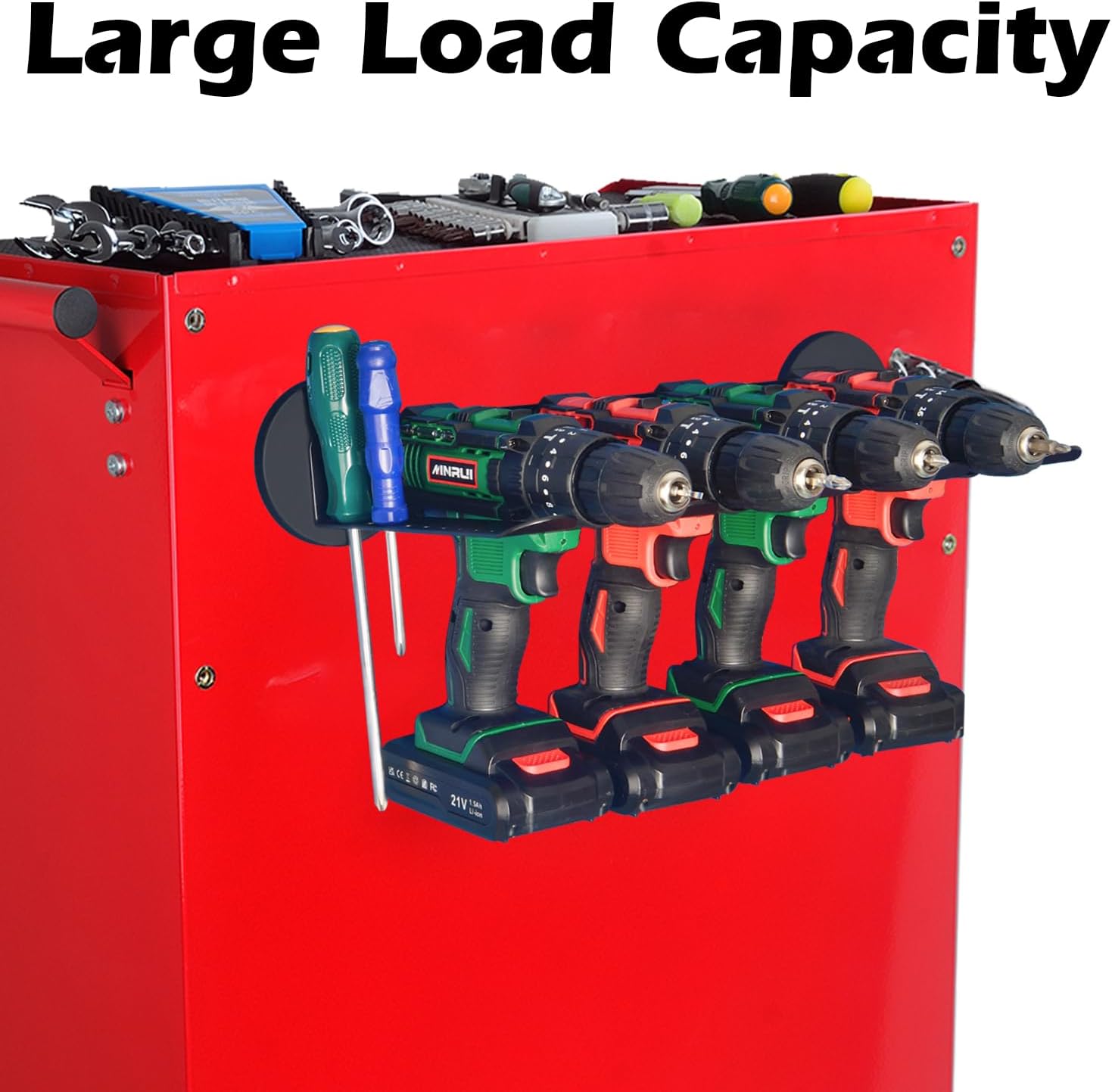 - Quick Access Magnet Drill Holder: 4 slots designed for any cordless tools with a handle, such as a circular saw, cordless impact wrench, or cordless drill. Attaching to any ferrous metal surface(tool box, tool chest steel workstation)