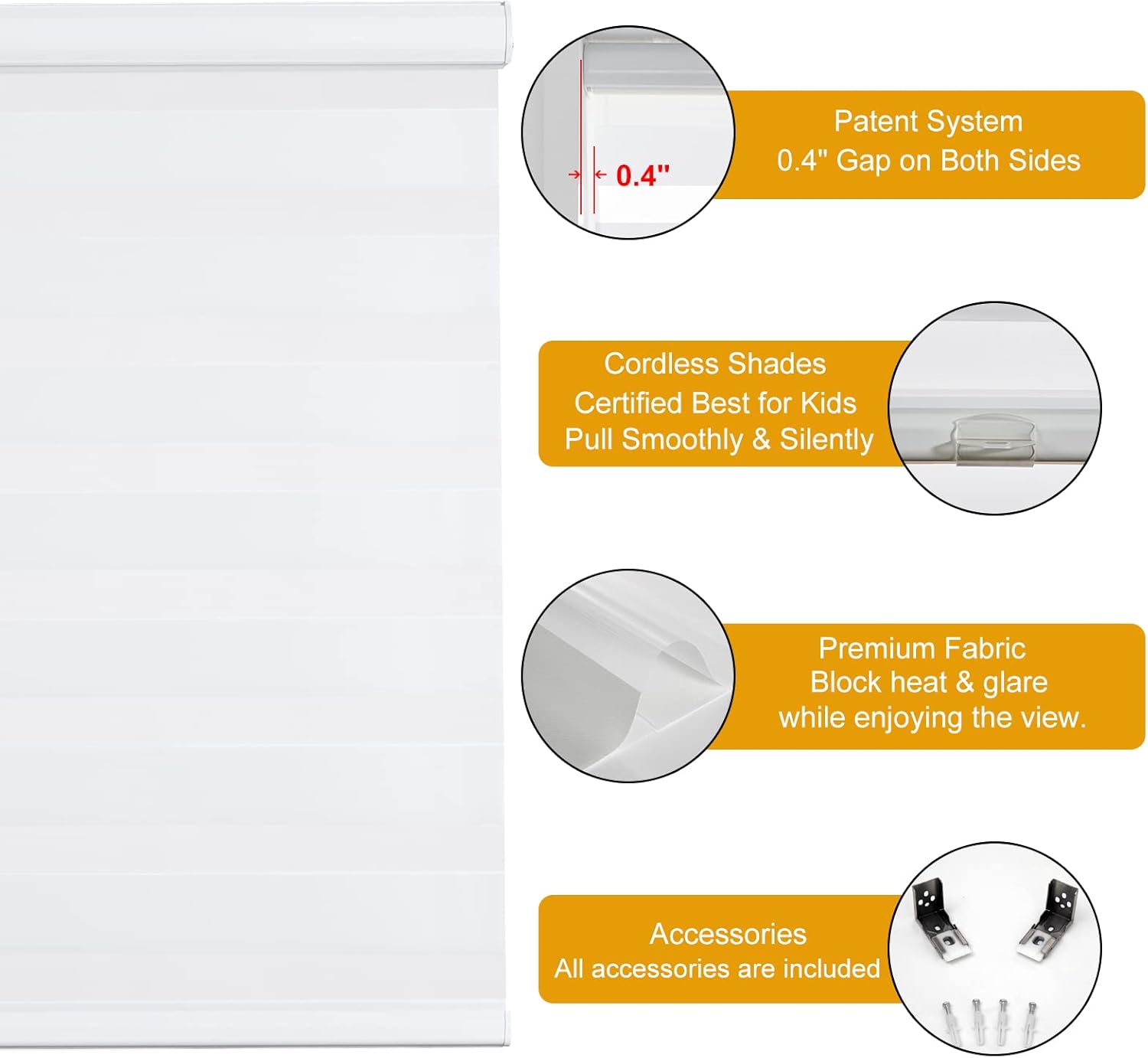 Persilux Cordless Zebra Blinds for Windows (58" W X 64" H, White) Free-Stop Roller Windows Shades Dual Layer Light Control for Day and Night, Light Filtering Sheer Shades for Home, Easy to Install
