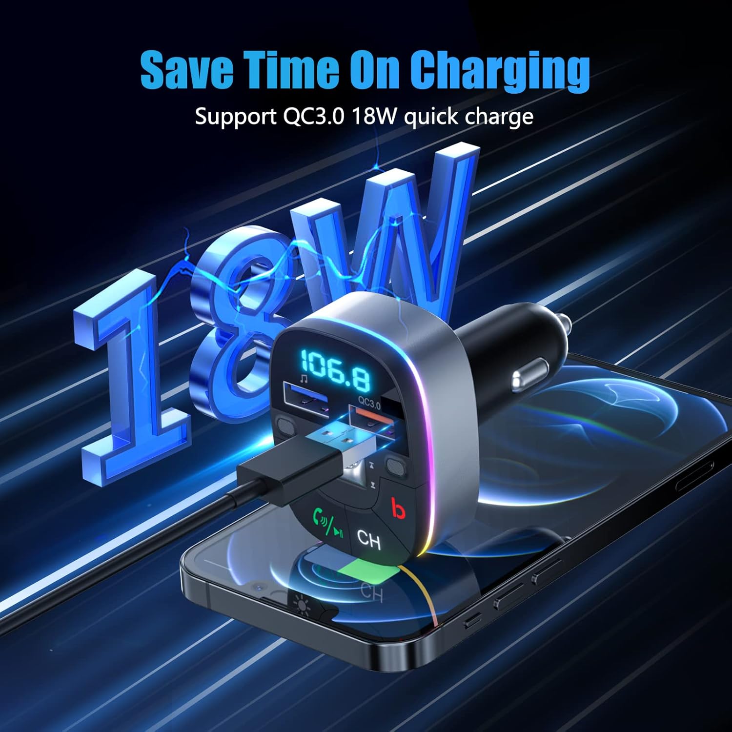 - QC3.0 Quick Charger and Dual USB Ports: The car charger features 2 USB ports, allowing you to charge 2 devices simultaneously with high-speed charging for both the driver and passenger. The QC3.0 quick charging port delivers 5V/3A, up to 18W max, while the second USB port (5V/1A) not only charges devices but also supports music playback from a USB stick in MP3, WMA, and WAV formats